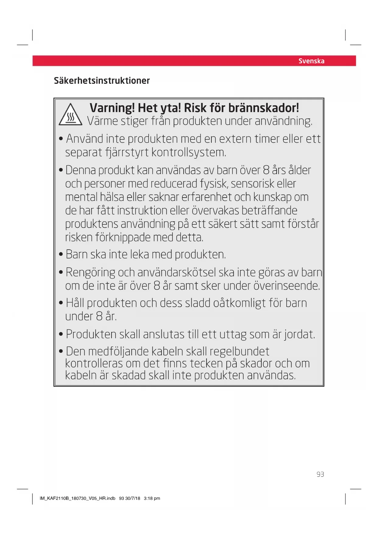 - Den medföljande kabeln skall regelbundet kontrolleras om det finns tecken på skador och om kabeln är skadad skall inte produkten användas. IM_KAF2110B_180730_V05_HR.indb 93 30/7/18 3:18 pmSize - A5 Svenska