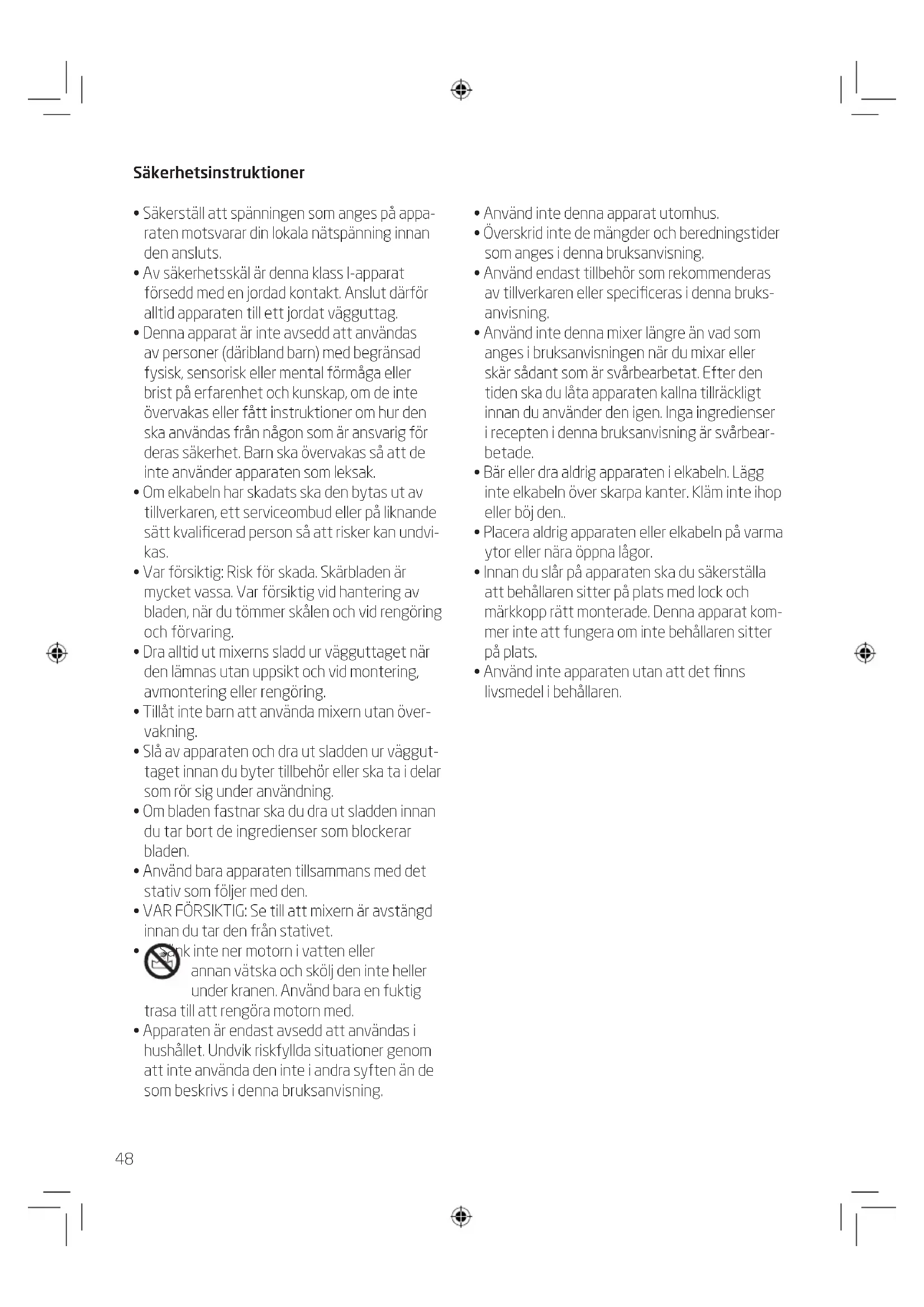 - Användintedennamixerlängreänvadsom angesibruksanvisningennärdumixareller skärsådantsomärsvårbearbetat.Efterden tidenskadulåtaapparatenkallnatillräckligt innanduanvänderdenigen.Ingaingredienser ireceptenidennabruksanvisningärsvårbear- betade.