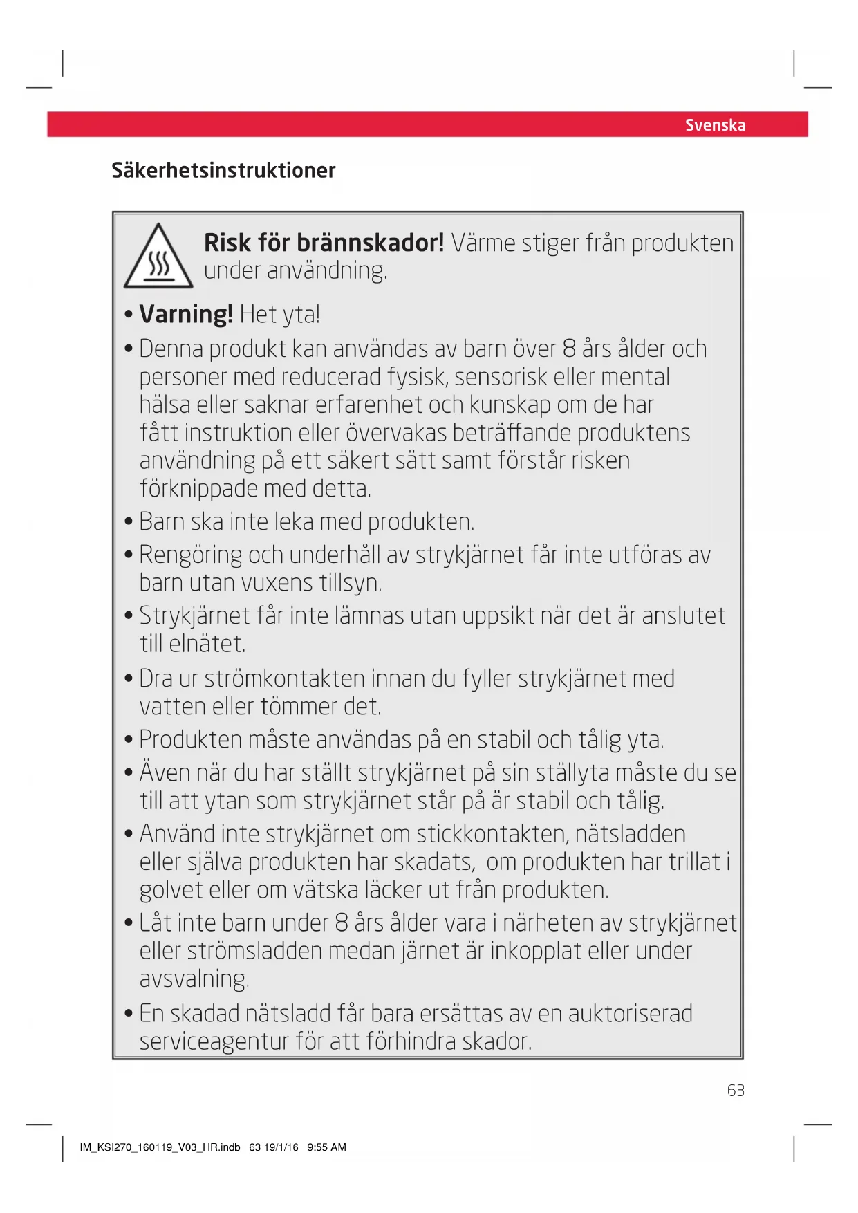 - En skadad nätsladd får bara ersättas av en auktoriserad serviceagentur för att förhindra skador. IM_KSI270_160119_V03_HR.indb 63 19/1/16 9:55 AMSvenska