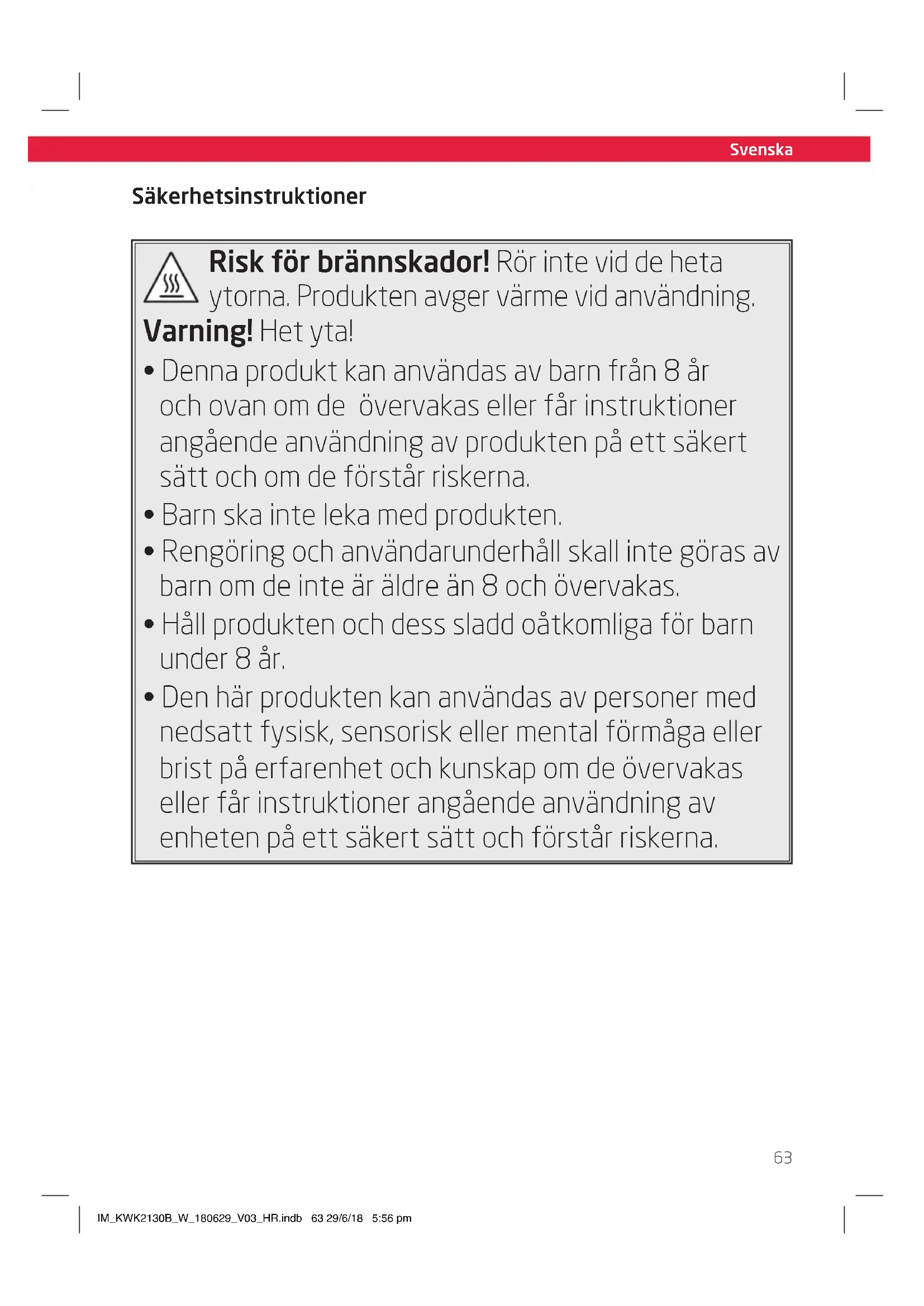 - Den här produkten kan användas av personer med nedsatt fysisk, sensorisk eller mental förmåga eller brist på erfarenhet och kunskap om de övervakas eller får instruktioner angående användning av enheten på ett säkert sätt och förstår riskerna. IM_KWK2130B_W_180629_V03_HR.indb 63 29/6/18 5:56 pmSize - A5 Svenska