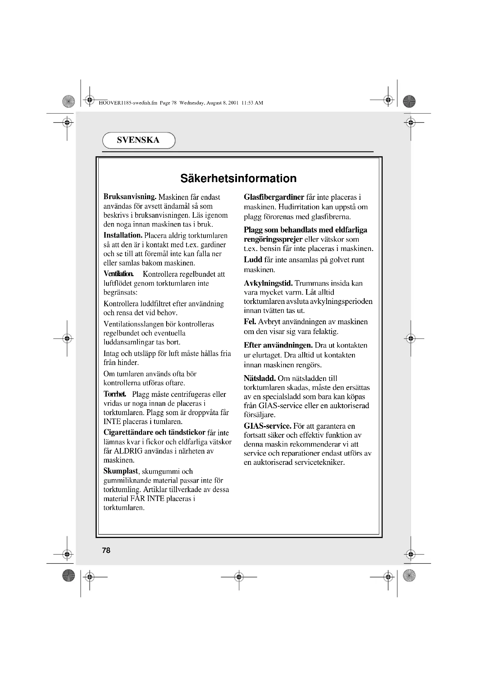 Säkerhetsinformation Bruksanvisning. Maskinen får endast användas för avsett ändamål så som beskrivs i bruksanvisningen. Läs igenom den noga innan maskinen tas i bruk. Installation. Placera aldrig torktumlaren så att den är i kontakt med t.ex. gardiner och se till att föremål inte kan falla ner eller samlas bakom maskinen. Ventilation. Kontrollera regelbundet att luftflödet genom torktumlaren inte begränsats: Kontrollera luddfiltret efter användning och rensa det vid behov. Ventilationsslangen bör kontrolleras regelbundet och eventuella luddansamlingar tas bort. Intag och utsläpp för luft måste hållas fria från hinder. Om tumlaren används ofta bör kontrollerna utföras oftare. Torrhet. Plagg måste centrifugeras eller vridas ur noga innan de placeras i torktumlaren. Plagg som är droppvåta får INTE placeras i tumlaren. Cigarettändare och tändstickor får inte lämnas kvar i fickor och eldfarliga vätskor får ALDRIG användas i närheten av maskinen. Skumplast , skumgummi och gummiliknande material passar inte för torktumling. Artiklar tillverkade av dessa material FÅR INTE placeras i torktumlaren. Glasfibergardiner får inte placeras i maskinen. Hudirritation kan uppstå om plagg förorenas med glasfibrerna. Plagg som behandlats med eldfarliga rengöringssprejer eller vätskor som t.ex. bensin får inte placeras i maskinen. Ludd får inte ansamlas på golvet runt maskinen. Avkylningstid. Trummans insida kan vara mycket varm. Låt alltid torktumlaren avsluta avkylningsperioden innan tvätten tas ut. Fel. Avbryt användningen av maskinen om den visar sig vara felaktig. Efter användningen. Dra ut kontakten ur elurtaget. Dra alltid ut kontakten innan maskinen rengörs. Nätsladd. Om nätsladden till torktumlaren skadas, måste den ersättas av en specialsladd som bara kan köpas från GIAS-service eller en auktoriserad försäljare. GIAS-service. För att garantera en fortsatt säker och effektiv funktion av denna maskin rekommenderar vi att service och reparationer endast utförs av en auktoriserad servicetekniker. HOOVER1185-swedish.fm Page 78 Wednesday, August 8, 2001 11:53 AMSVENSKA