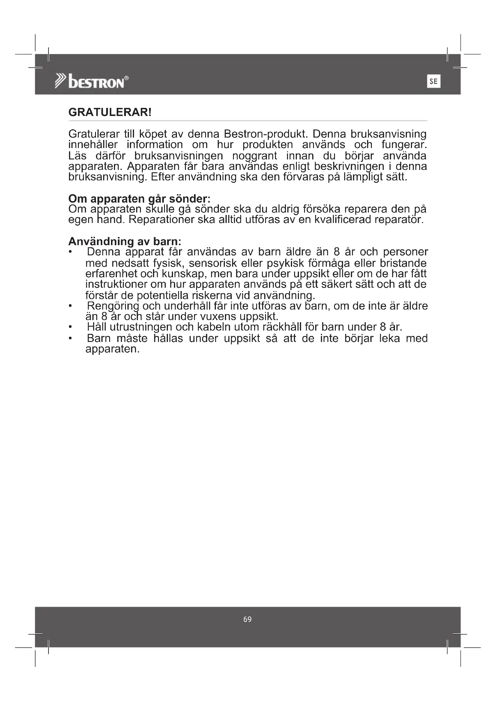 GRATULERAR! Gratulerar till köpet av denna Bestron-produkt. Denna bruksanvisning innehåller information om hur produkten används och fungerar. Läs därför bruksanvisningen noggrant innan du börjar använda apparaten. Apparaten får bara användas enligt beskrivningen i denna bruksanvisning. Efter användning ska den förvaras på lämpligt sätt. Om apparaten går sönder: Om apparaten skulle gå sönder ska du aldrig försöka reparera den på egen hand. Reparationer ska alltid utföras av en kvalificerad reparatör. Användning av barn: