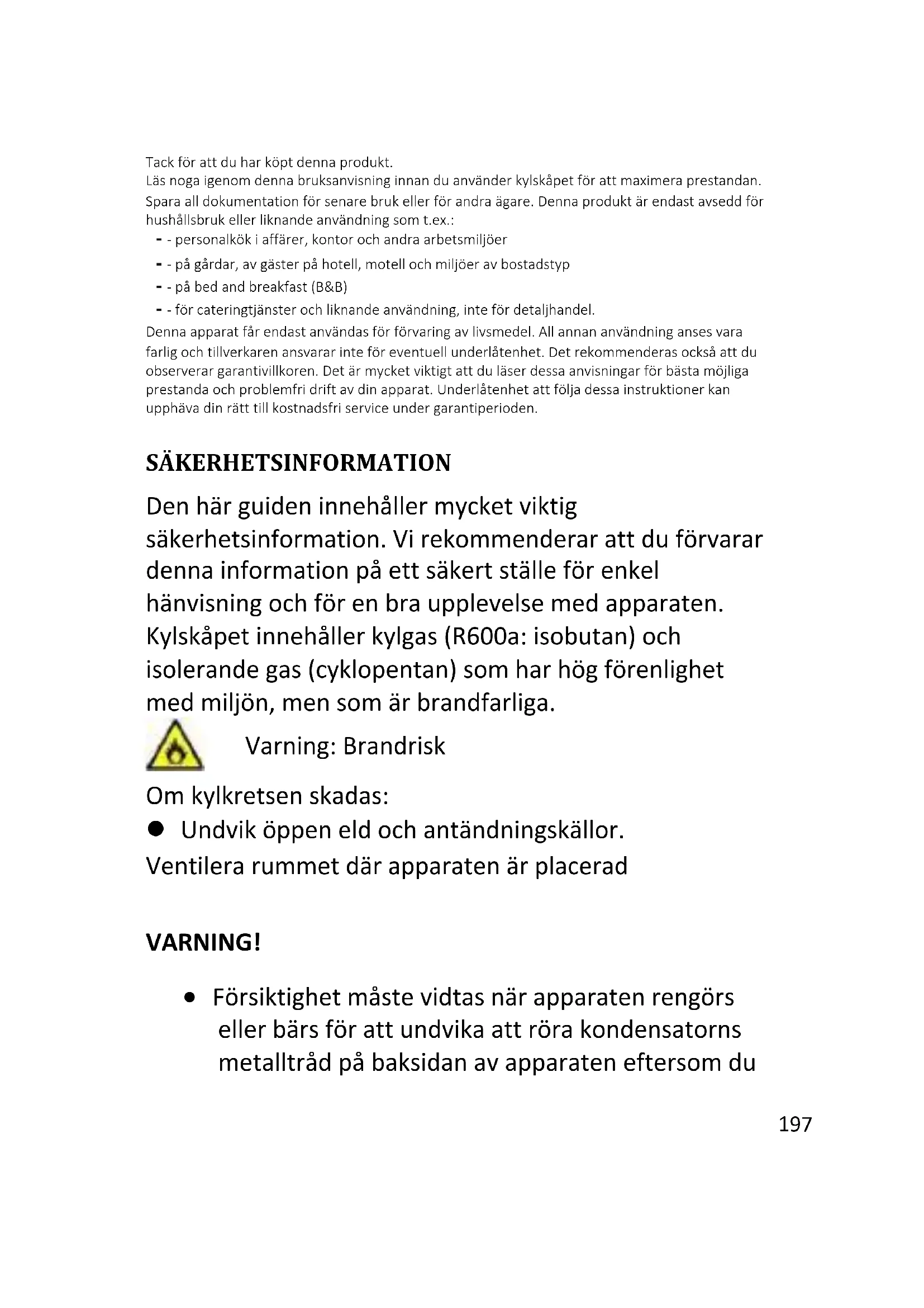 För vinkylskåp: ”Denna apparat är avsedd att uteslutande användas för förvaring av vin.”. För fristående kyl-/frysprodukter: ”Denna kyl-/frysprodukt är inte avsedd att användas som en inbyggd produkt.” För produkter utan något fyrstjärnigt fack:”Denna kyl-/frysprodukt är inte lämplig för infrysning av livsmedel.”