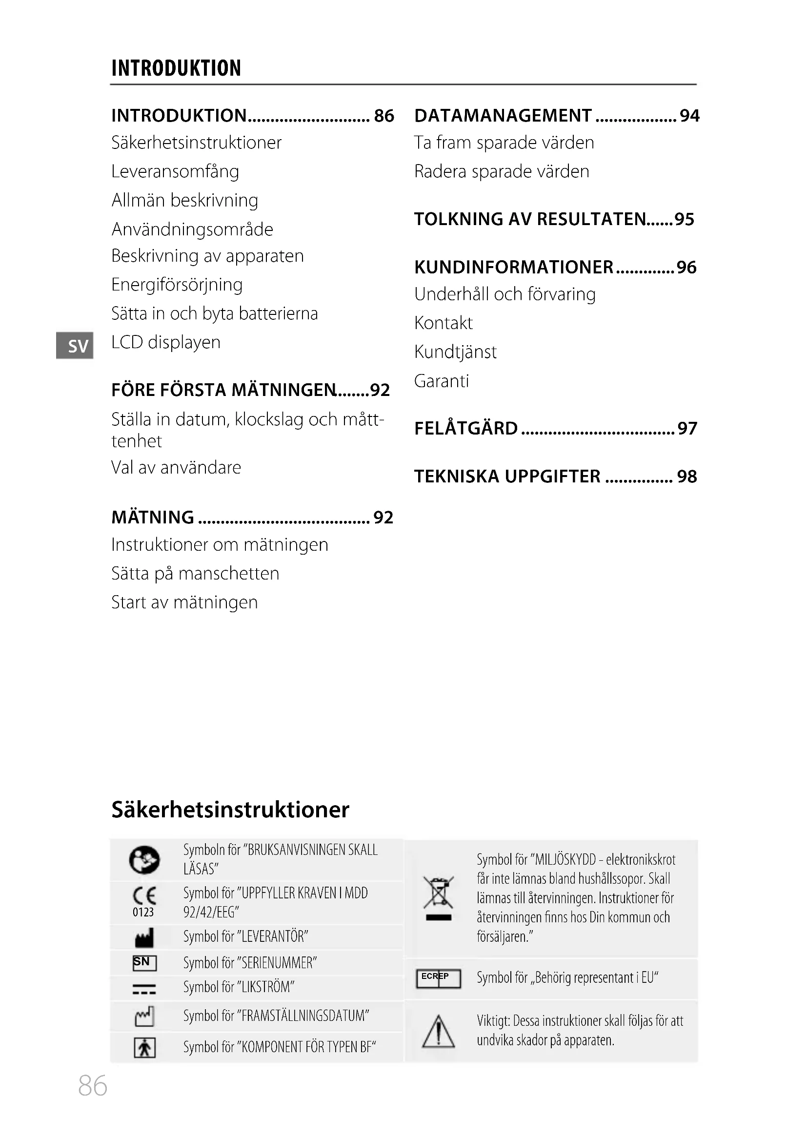 Symbol för ”SERIENUMMER” Symbol för ”LIKSTRÖM” Symbol för ”FRAMSTÄLLNINGSDATUM” Symbol för ”KOMPONENT FÖR TYPEN BF“ Symbol för ”MILJÖSKYDD - elektronikskrot får inte lämnas bland hushållssopor. Skall lämnas till återvinningen. Instruktioner för återvinningen finns hos Din kommun och försäljaren.” EC REP Symbol för „Behörig representant i EU“ Viktigt: Dessa instruktioner skall följas för att undvika skador på apparaten. SäkerhetsinstruktionerSV