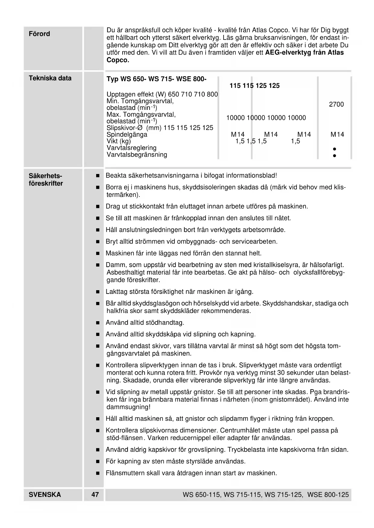 Pass på at bøylegrepet til FIXTEC-selvspennende mutter kun settes opp til tiltrek- king/løsing. Flensmutter Flensmutteren åpnes hhv. trekkes til med en hakenøkkel.NORSK 46 WS 650-115, WS 715-115, WS 715-125, WSE 800-125 Arbeidshenvis- ninger Under sliping må det ikke presses inn i arbeidsemnet, men slipeskiven må beveges jevnt frem og tilbake over arbeidsemnet. Skrubbsliping Den beste virkningen under skrubbsliping oppnås når slipeskiven settes på mot sli- peflaten i en vinkel på minst 30°C. For sterk belastning under slipingen skader vinkelsliperen og øker forbruket av sli- peskiver, slipeeffekten blir dårligere. Bruk aldri kutteskiver til skrubbsliping. Kutteskiver må ikke utsettes for sidetrykk. Kapping Under kapping må vinkelsliperen ikke kiles fast i slipeflaten. Kutteskiven må ha en ren skjærekant. Til kapping av stein er det foreskrevet å bruke føringsslede. Flatesliping Til flatesliping må det brukes kunststoffslipetallerken med slipeskive. Til fjerning av rust eller gamle malingslag egner seg en stålbørste. Vedlikehold Maskinen og ventilasjonsspaltene må alltid holdes rene. Bruk kun AEG tilbehør og reservedeler. Komponenter uten utskiftingsbeskrivelse i denne bruksanvisningen, må skiftes ut av AEG kundeservice (se brosjyre garanti/ kundeserviceadresser). Ved behov kan en eksplosjonstegning av maskinen bestilles hos kundeservice eller direkte hos Atlas Copco Electric Tools GmbH, Postfach 320, D-71361 Winnenden. Husk å oppgi maskintypen og det tisifrede nummeret som står på typeskiltet. Tilbehør Et utvalg av tilbehør finner du på side 2-3. Ytterligere tilbehør med bestillingsnum- rene finner du i våre katalogerSVENSKA 47 WS 650-115, WS 715-115, WS 715-125, WSE 800-125 Förord Du är anspråksfull och köper kvalité - kvalité från Atlas Copco. Vi har för Dig byggt ett hållbart och ytterst säkert elverktyg. Läs gärna bruksanvisningen, för endast in- gående kunskap om Ditt elverktyg gör att den är effektiv och säker i det arbete Du utför med den. Vi vill att Du även i framtiden väljer ett AEG-elverktyg från Atlas Copco. Tekniska data Säkerhets- föreskrifter ■ Beakta säkerhetsanvisningarna i bifogat informationsblad! ■ Borra ej i maskinens hus, skyddsisoleringen skadas då (märk vid behov med klis- termärken). ■ Drag ut stickkontakt från eluttaget innan arbete utföres på maskinen. ■ Se till att maskinen är frånkopplad innan den anslutes till nätet. ■ Håll anslutningsledningen bort från verktygets arbetsområde. ■ Bryt alltid strömmen vid ombyggnads- och servicearbeten. ■ Maskinen får inte läggas ned förrän den stannat helt. ■ Damm, som uppstår vid bearbetning av sten med kristallkiselsyra, är hälsofarligt. Asbesthaltigt material får inte bearbetas. Ge akt på hälso- och olycksfallförebyg- gande föreskrifter. ■ Lakttag största försiktighet när maskinen är igång. ■ Bär alltid skyddsglasögon och hörselskydd vid arbete. Skyddshandskar, stadiga och halkfria skor samt skyddskläder rekommenderas. ■ Använd alltid stödhandtag. ■ Använd alltid skyddskåpa vid slipning och kapning. ■ Använd endast skivor, vars tillåtna varvtal är minst så högt som det högsta tom- gångsvarvtalet på maskinen. ■ Kontrollera slipverktygen innan de tas i bruk. Slipverktyget måste vara ordentligt monterat och kunna rotera fritt. Provkör nya verktyg minst 30 sekunder utan belast- ning. Skadade, orunda eller vibrerande slipverktyg får inte längre användas. ■ Vid slipning av metall uppstår gnistor. Se till att personer inte skadas. Pga brandris- ken får inga brännbara material finnas i närheten (inom gnistområdet). Använd inte dammsugning! ■ Håll alltid maskinen så, att gnistor och slipdamm flyger i riktning från kroppen. ■ Kontrollera slipskivornas dimensioner. Centrumhålet måste utan spel passa på stöd-flänsen. Varken reducernippel eller adapter får användas. ■ Använd aldrig kapskivor för grovslipning. Tryckbelasta inte kapskivorna från sidan. ■ För kapning av sten måste styrsläde användas. ■ Flänsmuttern skall vara åtdragen innan start av maskinen. Typ WS 650- WS 715- WSE 800-
