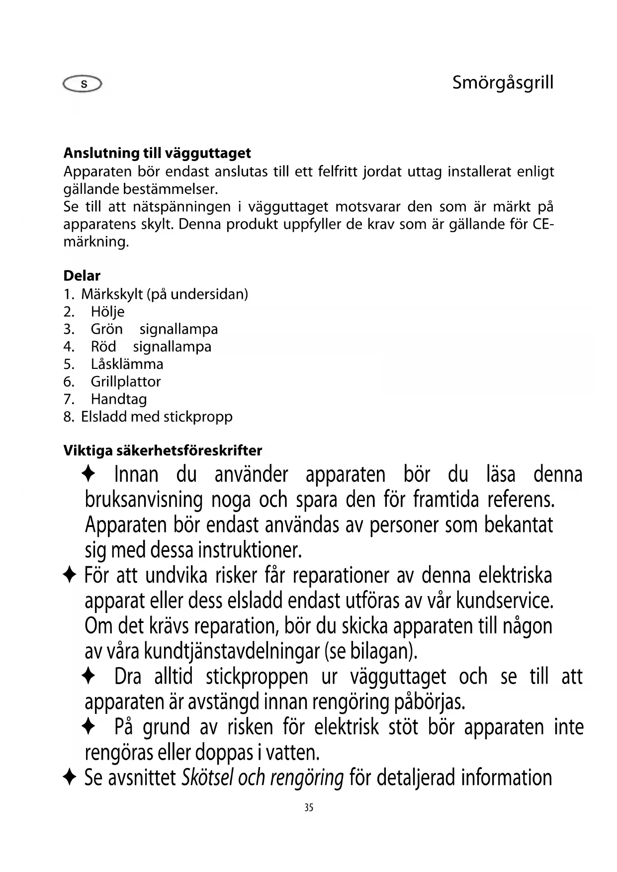Viktiga säkerhetsföreskrifter ✦ Innan du använder apparaten bör du läsa denna bruksanvisning noga och spara den för framtida referens. Apparaten bör endast användas av personer som bekantat sig med dessa instruktioner. ✦ För att undvika risker får reparationer av denna elektriska apparat eller dess elsladd endast utföras av vår kundservice. Om det krävs reparation, bör du skicka apparaten till någon av våra kundtjänstavdelningar (se bilagan). ✦ Dra alltid stickproppen ur vägguttaget och se till att apparaten är avstängd innan rengöring påbörjas. ✦ På grund av risken för elektrisk stöt bör apparaten inte rengöras eller doppas i vatten. ✦ Se avsnittet Skötsel och rengöring för detaljerad information S36 om hur apparaten bör rengöras. ✦ Apparaten bör inte användas med hjälp av en extern timer eller separat ärrkontroll.