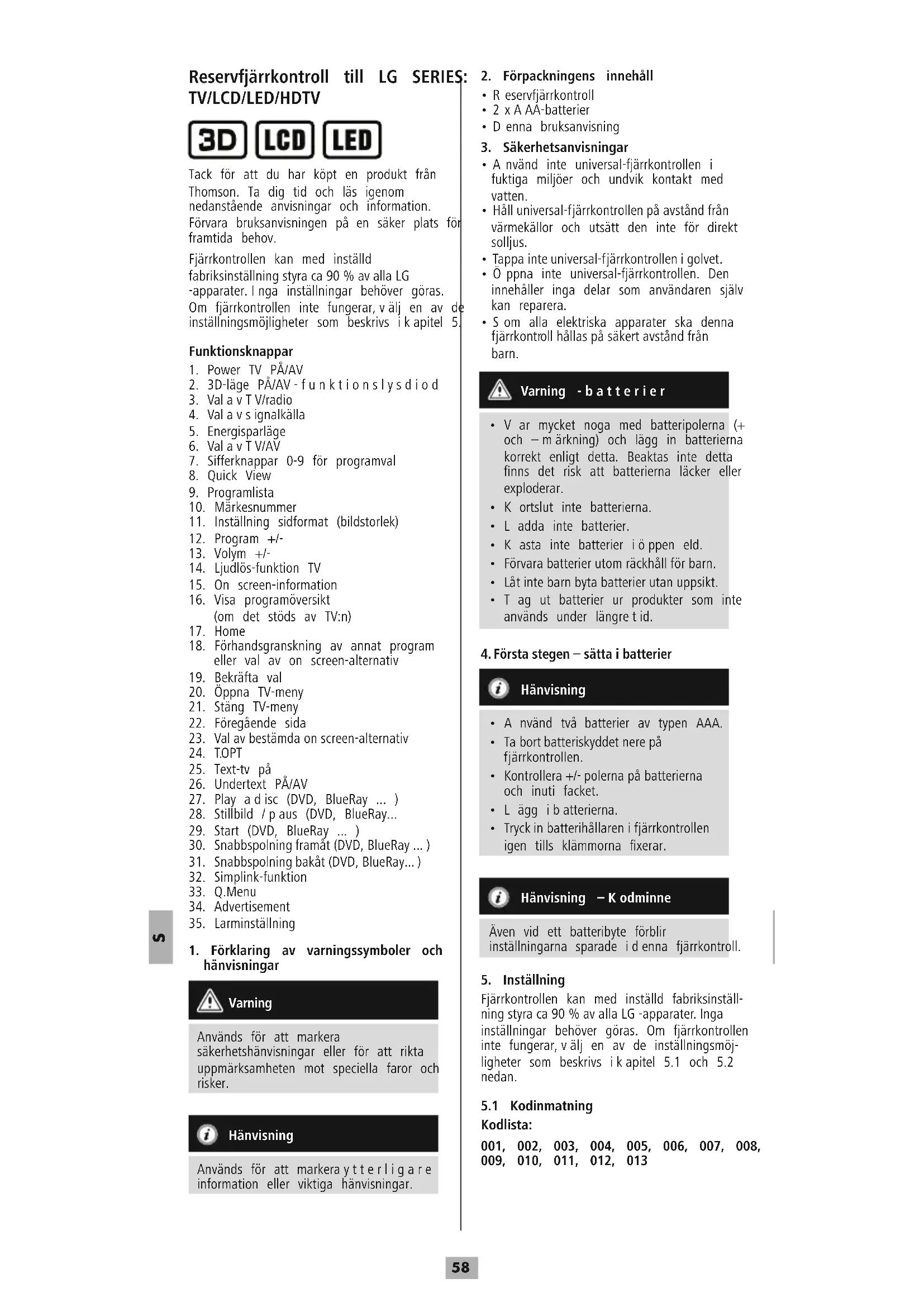 Tack för att du har köpt en produkt från Thomson. Ta dig tid och läs igenom nedanstående anvisningar och information. Förvara bruksanvisningen på en säker plats för framtida behov. Fjärrkontrollen kan med inställd fabriksinställning styraca90%avalla LG -apparater.Inga inställningar behöver göras. Om fjärrkontrollen inte fungerar,välj en av de inställningsmöjligheter som beskrivs ikapitel 5. Funktionsknappar
