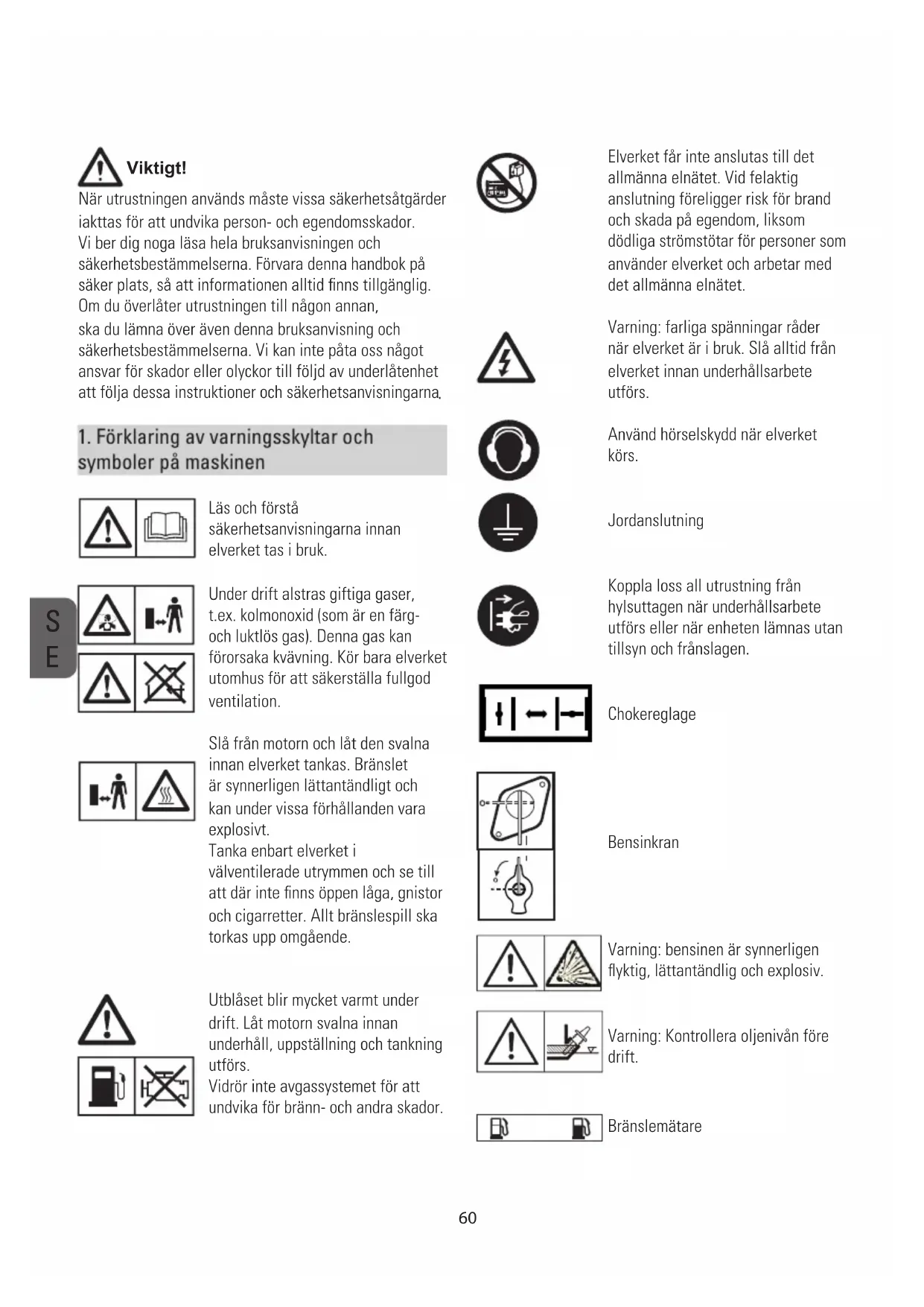 K60 Elverket får inte anslutas till det allmänna elnätet. Vid felaktig anslutning föreligger risk för brand och skada på egendom, liksom dödliga strömstötar för personer som använder elverket och arbetar med det allmänna elnätet. Varning: farliga spänningar råder när elverket är i bruk. Slå alltid från elverket innan underhållsarbete utförs. Använd hörselskydd när elverket körs. Jordanslutning Koppla loss all utrustning från hylsuttagen när underhållsarbete utförs eller när enheten lämnas utan tillsyn och frånslagen. Chokereglage Bensinkran Varning: bensinen är synnerligen flyktig, lättantändlig och explosiv. Varning: Kontrollera oljenivån före drift. Bränslemätare Viktigt! När utrustningen används måste vissa säkerhetsåtgärder iakttas för att undvika person- och egendomsskador. Vi ber dig noga läsa hela bruksanvisningen och säkerhetsbestämmelserna. Förvara denna handbok på säker plats, så att informationen alltid finns tillgänglig. Om du överlåter utrustningen till någon annan, ska du lämna över även denna bruksanvisning och säkerhetsbestämmelserna. Vi kan inte påta oss något ansvar för skador eller olyckor till följd av underlåtenhet att följa dessa instruktioner och säkerhetsanvisningarna