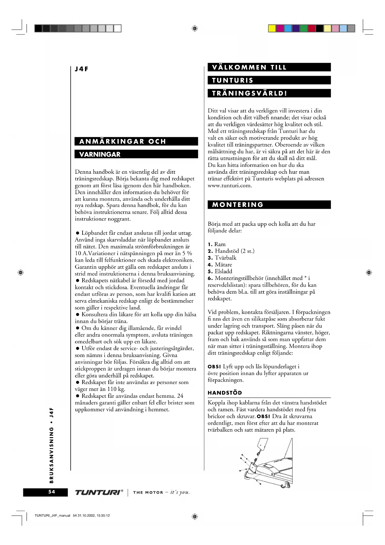 - -10 % Motor ,75 HK Alla Tunturimodeller har konstruerats för att uppfylla EU:s EMC-direktiv gällande elektromagnetisk kompatibilitet (89/336/EEC) och elutrustning som utformats för användning inom vissa gränser för spänningen (73/23/EEC). Därför är denna produkt försedd med CE- konformitetsmärkning. På grund av vår policy för kontinuerlig produktutveckling förbehåller vi, Tunturi, oss rätten till ändringar. OBS! Instruktionerna måste följas noggrannt vid montering, användning och underhåll av redskapet. Garantin gäller inte skador som uppkommit pga. underlåtande att iaktta de instruktioner för montering, justering och underhåll som beskrivits här. Redskapet som modifi eras eller förändras på ett sätt som inte är godkänt av Tunturi Oy Ltd får inte användas. Vi önskar dig mycket nöje i träningen med din nya träningspartner från Tunturi. TUNTURI_J4F_manual 61 31.10.2002, 15:35:1962 p. 1