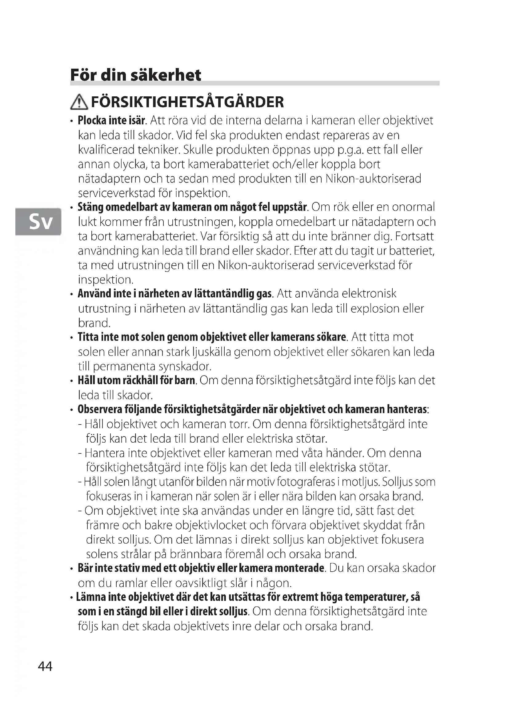 - Plocka inte isär. Att röra vid de interna delarna i kameran eller objektivet kan leda till skador. Vid fel ska produkten endast repareras av en kvalificerad tekniker. Skulle produkten öppnas upp p.g.a. ett fall eller annan olycka, ta bort kamerabatteriet och/eller koppla bort nätadaptern och ta sedan med produkten till en Nikon-auktoriserad serviceverkstad för inspektion.