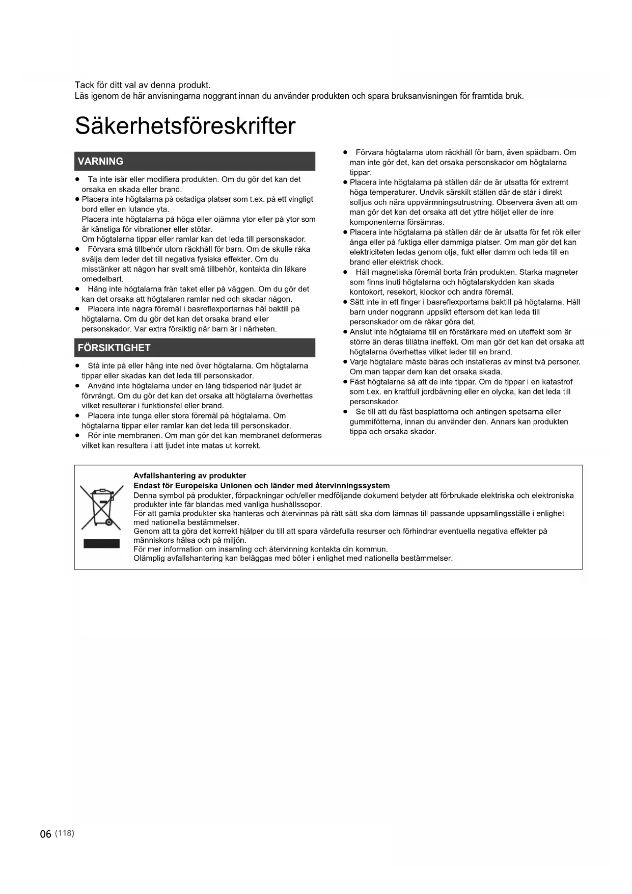 SB-G90_TQBM0081_PPCEBEGGN_mst.book 19 ページ 2017年2月10日 金曜日 午前10時39分Tack för ditt val av denna produkt. Läs igenom de här anvisningarna noggrant innan du använder produkten och spara bruksanvisningen för framtida bruk. Säkerhetsföreskrifter ≥ Ta inte isär eller modifiera produkten. Om du gör det kan det orsaka en skada eller brand. ≥ Placera inte högtalarna på ostadiga platser som t.ex. på ett vingligt bord eller en lutande yta. Placera inte högtalarna på höga eller ojämna ytor eller på ytor som är känsliga för vibrationer eller stötar. Om högtalarna tippar eller ramlar kan det leda till personskador. ≥ Förvara små tillbehör utom räckhåll för barn. Om de skulle råka svälja dem leder det till negativa fysiska effekter. Om du misstänker att någon har svalt små tillbehör, kontakta din läkare omedelbart. ≥ Häng inte högtalarna från taket eller på väggen. Om du gör det kan det orsaka att högtalaren ramlar ned och skadar någon. ≥ Placera inte några föremål i basreflexportarnas hål baktill på högtalarna. Om du gör det kan det orsaka brand eller personskador. Var extra försiktig när barn är i närheten. ≥ Stå inte på eller häng inte ned över högtalarna. Om högtalarna tippar eller skadas kan det leda till personskador. ≥ Använd inte högtalarna under en lång tidsperiod när ljudet är förvrängt. Om du gör det kan det orsaka att högtalarna överhettas vilket resulterar i funktionsfel eller brand. ≥ Placera inte tunga eller stora föremål på högtalarna. Om högtalarna tippar eller ramlar kan det leda till personskador. ≥ Rör inte membranen. Om man gör det kan membranet deformeras vilket kan resultera i att ljudet inte matas ut korrekt. ≥ Förvara högtalarna utom räckhåll för barn, även spädbarn. Om man inte gör det, kan det orsaka personskador om högtalarna tippar. ≥ Placera inte högtalarna på ställen där de är utsatta för extremt höga temperaturer. Undvik särskilt ställen där de står i direkt solljus och nära uppvärmningsutrustning. Observera även att om man gör det kan det orsaka att det yttre höljet eller de inre komponenterna försämras. ≥ Placera inte högtalarna på ställen där de är utsatta för fet rök eller ånga eller på fuktiga eller dammiga platser. Om man gör det kan elektriciteten ledas genom olja, fukt eller damm och leda till en brand eller elektrisk chock. ≥ Håll magnetiska föremål borta från produkten. Starka magneter som finns inuti högtalarna och högtalarskydden kan skada kontokort, resekort, klockor och andra föremål. ≥ Sätt inte in ett finger i basreflexportarna baktill på högtalarna. Håll barn under noggrann uppsikt eftersom det kan leda till personskador om de råkar göra det. ≥ Anslut inte högtalarna till en förstärkare med en uteffekt som är större än deras tillåtna ineffekt. Om man gör det kan det orsaka att högtalarna överhettas vilket leder till en brand. ≥ Varje högtalare måste bäras och installeras av minst två personer. Om man tappar dem kan det orsaka skada. ≥ Fäst högtalarna så att de inte tippar. Om de tippar i en katastrof som t.ex. en kraftfull jordbävning eller en olycka, kan det leda till personskador. ≥ Se till att du fäst basplattorna och antingen spetsarna eller gummifötterna, innan du använder den. Annars kan produkten tippa och orsaka skador. VARNING FÖRSIKTIGHET Avfallshantering av produkter Endast för Europeiska Unionen och länder med återvinningssystem Denna symbol på produkter, förpackningar och/eller medföljande dokument betyder att förbrukade elektriska och elektroniska produkter inte får blandas med vanliga hushållssopor. För att gamla produkter ska hanteras och återvinnas på rätt sätt ska dom lämnas till passande uppsamlingsställe i enlighet med nationella bestämmelser. Genom att ta göra det korrekt hjälper du till att spara värdefulla resurser och förhindrar eventuella negativa effekter på människors hälsa och på miljön. För mer information om insamling och återvinning kontakta din kommun. Olämplig avfallshantering kan beläggas med böter i enlighet med nationella bestämmelser.