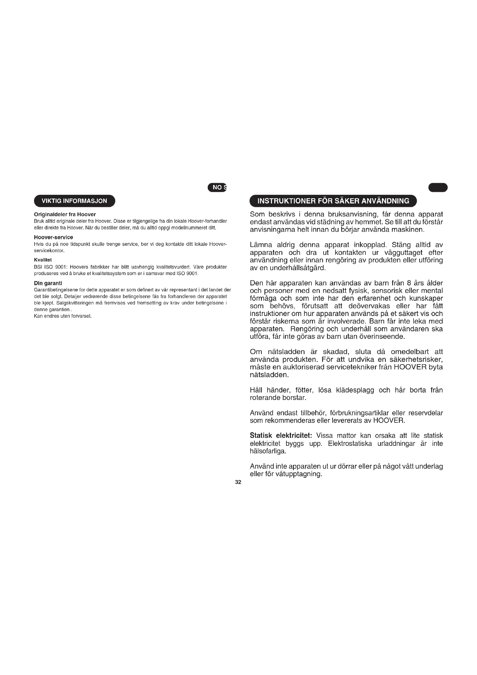 - Har støvsugeren blitt overopphetet? Hvis det er tilfellet vil det ta omtrent 30 minutter før den blir automatisk nullstilt.32 VIKTIG INFORMASJON OriginaldelerfraHoover Bruk alltid originale deler fra Hoover. Disse er tilgjengelige fra din lokale Hoover-forhandler eller direkte fra Hoover. Når du bestiller deler, må du alltid oppgi modellnummeret ditt. Hoover-service Hvis du på noe tidspunkt skulle trenge service, ber vi deg kontakte ditt lokale Hoover- servicekontor. Kvalitet BSI ISO 9001: Hoovers fabrikker har blitt uavhengig kvalitetsvurdert. Våre produkter produseres ved å bruke et kvalitetssystem som er i samsvar med ISO 9001. Dingaranti Garantibetingelsene for dette apparatet er som denert av vår representant i det landet der det ble solgt. Detaljer vedrørende disse betingelsene fås fra forhandleren der apparatet ble kjøpt. Salgskvitteringen må fremvises ved fremsetting av krav under betingelsene i denne garantien.. Kan endres uten forvarsel. NO SE INSTRUKTIONER FÖR SÄKER ANVÄNDNING Som beskrivs i denna bruksanvisning, får denna apparat endast användas vid städning av hemmet. Se till att du förstår anvisningarna helt innan du börjar använda maskinen. Lämna aldrig denna apparat inkopplad. Stäng alltid av apparaten och dra ut kontakten ur vägguttaget efter användning eller innan rengöring av produkten eller utföring av en underhållsåtgärd. Den här apparaten kan användas av barn från 8 års ålder och personer med en nedsatt fysisk, sensorisk eller mental förmåga och som inte har den erfarenhet och kunskaper som behövs, förutsatt att deövervakas eller har fått instruktioner om hur apparaten används på et säkert vis och förstår riskerna som är involverade. Barn får inte leka med apparaten. Rengöring och underhåll som användaren ska utföra, får inte göras av barn utan överinseende. Om nätsladden är skadad, sluta då omedelbart att använda produkten. För att undvika en säkerhetsrisker, måste en auktoriserad servicetekniker från HOOVER byta nätsladden. Håll händer, fötter, lösa klädesplagg och hår borta från roterande borstar. Använd endast tillbehör, förbrukningsartiklar eller reservdelar som rekommenderas eller levererats av HOOVER. Statisk elektricitet: Vissa mattor kan orsaka att lite statisk elektricitet byggs upp. Elektrostatiska urladdningar är inte hälsofarliga. Använd inte apparaten ut ur dörrar eller på något vått underlag eller för våtupptagning.33