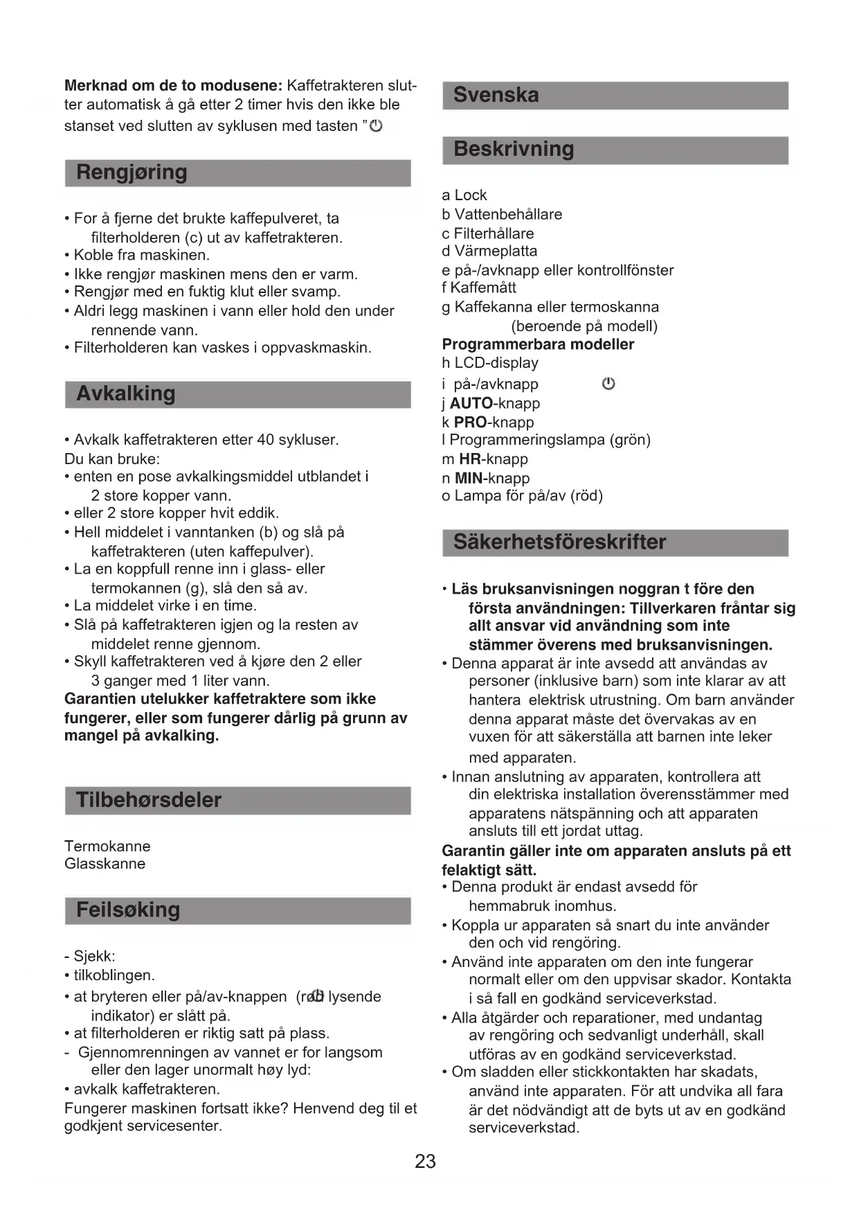 - Om sladden eller stickkontakten har skadats, använd inte apparaten. För att undvika all fara är det nödvändigt att de byts ut av en godkänd serviceverkstad. Svenska Beskrivning Säkerhetsföreskrifter Avkalking Tilbehørsdeler Feilsøking Rengjøring cafetière CM 823 EU11 :cafetière CM 823 16/11/10 11:17 Page2324