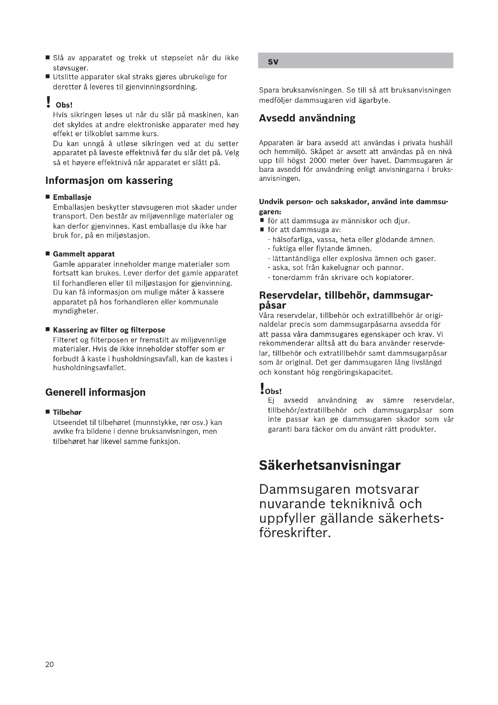 Spara bruksanvisningen. Se till så att bruksanvisningen medföljer dammsugaren vid ägarbyte. Avsedd användning Apparaten är bara avsedd att användas i privata hushåll och hemmiljö. Skåpet är avsett att användas på en nivå upp till högst 2000 meter över havet. Dammsugaren är bara avsedd för användning enligt anvisningarna i bruks- anvisningen. Undvik person- och sakskador, använd inte dammsu- garen: för att dammsuga av människor och djur. för att dammsuga av: - hälsofarliga, vassa, heta eller glödande ämnen. - fuktiga eller flytande ämnen. - lättantändliga eller explosiva ämnen och gaser. - aska, sot från kakelugnar och pannor. - tonerdamm från skrivare och kopiatorer. Reservdelar, tillbehör, dammsugar- påsar Våra reservdelar, tillbehör och extratillbehör är origi- naldelar precis som dammsugarpåsarna avsedda för att passa våra dammsugares egenskaper och krav. Vi rekommenderar alltså att du bara använder reservde- lar, tillbehör och extratillbehör samt dammsugarpåsar som är original. Det ger dammsugaren lång livslängd och konstant hög rengöringskapacitet. !Obs! Ej avsedd användning av sämre reservdelar, tillbehör/extratillbehör och dammsugarpåsar som inte passar kan ge dammsugaren skador som vår garanti bara täcker om du använt rätt produkter. Säkerhetsanvisningar Dammsugaren motsvarar nuvarande tekniknivå och uppfyller gällande säkerhets- föreskrifter.21 Barn under 8 år och personer med begränsad fysisk, senso- risk eller mental färdighet eller som saknar erfarenhet eller kunskaper får bara använda enheten under över- inseende av någon eller om de får lära sig hur man använ- der enheten säkert och vilka risker som finns. Låt inte barn leka med enhe- ten. Barn får bara göra rengöring och skötsel under uppsikt. Plastpåsar och plastfolie ska hållas utom räckhåll för barn. => Kvävningsrisk föreligger! Avsedd användning Anslut och använd bara dammsugaren enligt märkskylten. Dammsug aldrig utan dammsugarpåse resp. - behållare, motorskydds- och utblåsfilter. => Dammsugaren kan skadas! Dammsug aldrig med munstycke eller rör i närheten av huvudet. => Olycksrisk! Dammsuger du trappor, så ska enheten alltid stå nedanför användaren. Använd inte sladden för att bära/transportera dammsugaren. Är sladden till enheten skadad, så är det bara tillverkaren, service eller behörig elektriker som får byta ut den, allt för att undvika skador. Dra ut sladden helt om du ska dammsuga längre än 30 minuter. Dra i kontakten, inte i sladden, när du tar ur elanslutningen till dammsugaren. Dra inte sladden över vassa kanter och se till så att den inte blir fastklämd. Se till så att kontakten inte slår emot personer, kroppsdelar, husdjur eller föremål vid automatiskt sladdindrag. => Styr sladden med kontakten. Slå alltid av och dra ur kontakten före arbeten på dammsugaren. Använd inte dammsugaren om den är trasig. Dra ut kontakten ur uttaget om dammsugaren är trasig. Det är bara auktoriserad serviceverkstad som får göra reparationer och byta reservdelar på dammsugaren, allt för att undvika risker i användningen. Skydda dammsugaren från påverkan av väder, fukt och värme. Använd aldrig brännbara eller alkoholhaltiga ämnen på filtren (dammsugarpåse, motorskydds-, utblåsfilter etc). Dammsugaren är inte avsedd för användning på byggarbetsplatser. => Uppsugning av byggmaterial kan skada enheten. Slå av enheten och dra ur kontakten när du inte dammsuger. Gör uttjänta enheter obrukbara direkt, släng dem sedan i återvinningen. !Obs! Går säkringen när du startar dammsugaren, kan det bero på att du har andra elprodukter med hög effekt anslutna samtidigt till samma avsäkring (propp). Ställ in enheten på lägsta effektläget innan du slår på och öka sedan effekt, så går inte säkringen. Avfallshantering Förpackningen Förpackningen skyddar dammsugaren från skador vid transporten. Förpackningen är gjord av miljövänliga material och går att återvinna. Släng förpackningsmaterial du inte längre behöver i återvinningen. Uttjänt enhet Uttjänta enheter innehåller ofta värdefulla material. Lämna därför in din uttjänta dammsugare till din återförsäljare resp. släng den i återvinningen. Information om återvinning får du hos din återförsäljare eller kommun. Kassering av filter och dammpåse Filter och dammpåse är tillverkade i miljövänliga material. Om de inte innehåller några förbjudna ämnen kan de kastas i hushållssoporna. Allmänna anvisningar Tillbehör Utseendet på tillbehören (munstycke, dammsugarrör etc.) kan avvika från bilderna i bruksanvisningen, men funktionen är densamma.22
