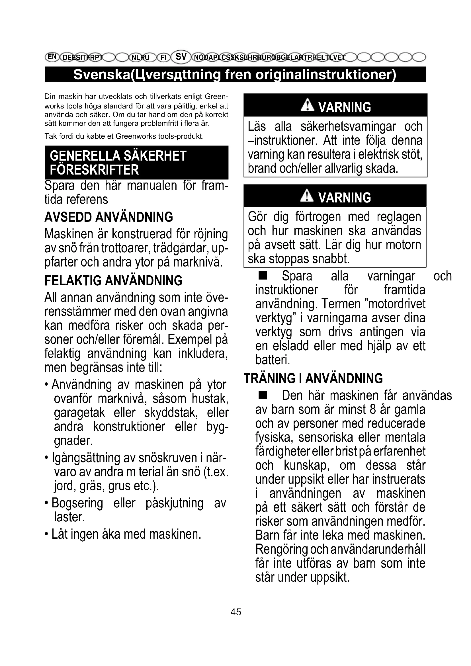 Den här maskinen får användas av barn som är minst 8 år gamla och av personer med reducerade fysiska, sensoriska eller mentala färdigheter eller brist på erfarenhet och kunskap, om dessa står under uppsikt eller har instruerats i användningen av maskinen på ett säkert sätt och förstår de risker som användningen medför. Barn får inte leka med maskinen. Rengöring och användarunderhåll får inte utföras av barn som inte står under uppsikt. Din maskin har utvecklats och tillverkats enligt Green- works tools höga standard för att vara pålitlig, enkel att använda och säker. Om du tar hand om den på korrekt sätt kommer den att fungera problemfritt i flera år. Tak fordi du købte et Greenworks tools-produkt.