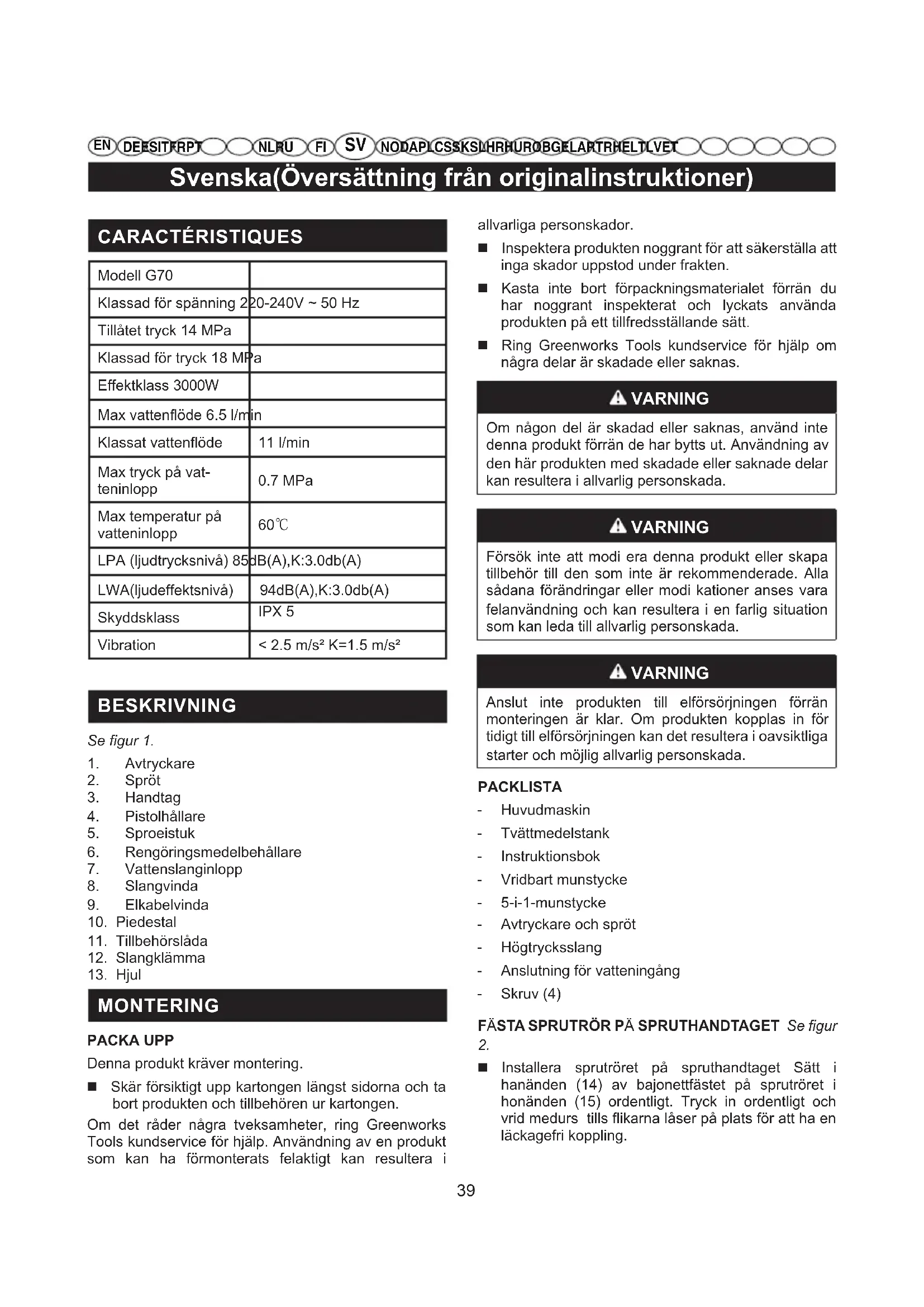 MONTERING PACKA UPP Denna produkt kräver montering. Skär försiktigt upp kartongen längst sidorna och ta bort produkten och tillbehören ur kartongen. Om det råder några tveksamheter, ring Greenworks Tools kundservice för hjälp. Användning av en produkt som kan ha förmonterats felaktigt kan resultera i allvarliga personskador. Inspektera produkten noggrant för att säkerställa att inga skador uppstod under frakten. Kasta inte bort förpackningsmaterialet förrän du har noggrant inspekterat och lyckats använda produkten på ett tillfredsställande sätt. Ring Greenworks Tools kundservice för hjälp om några delar är skadade eller saknas. VARNING Om någon del är skadad eller saknas, använd inte denna produkt förrän de har bytts ut. Användning av den här produkten med skadade eller saknade delar kan resultera i allvarlig personskada. VARNING Försök inte att modi era denna produkt eller skapa tillbehör till den som inte är rekommenderade. Alla sådana förändringar eller modi kationer anses vara felanvändning och kan resultera i en farlig situation som kan leda till allvarlig personskada. VARNING Anslut inte produkten till elförsörjningen förrän monteringen är klar. Om produkten kopplas in för tidigt till elförsörjningen kan det resultera i oavsiktliga starter och möjlig allvarlig personskada. PACKLISTA - Huvudmaskin - Tvättmedelstank - Instruktionsbok - Vridbart munstycke - 5-i-1-munstycke - Avtryckare och spröt - Högtrycksslang - Anslutning för vatteningång - Skruv (4) FÄSTA SPRUTRÖR PÄ SPRUTHANDTAGET Se figur