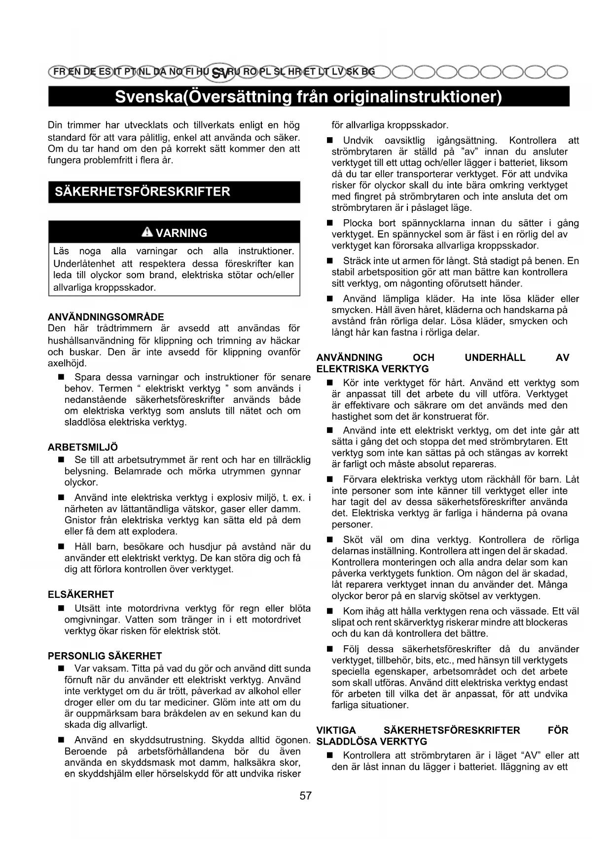 FR EN DE ES IT PT NL DA NO FI HU CS RU RO PL SL HR ET LT LV SK BG Din trimmer har utvecklats och tillverkats enligt en hög standard för att vara pålitlig, enkel att använda och säker. Om du tar hand om den på korrekt sätt kommer den att fungera problemfritt i era år.