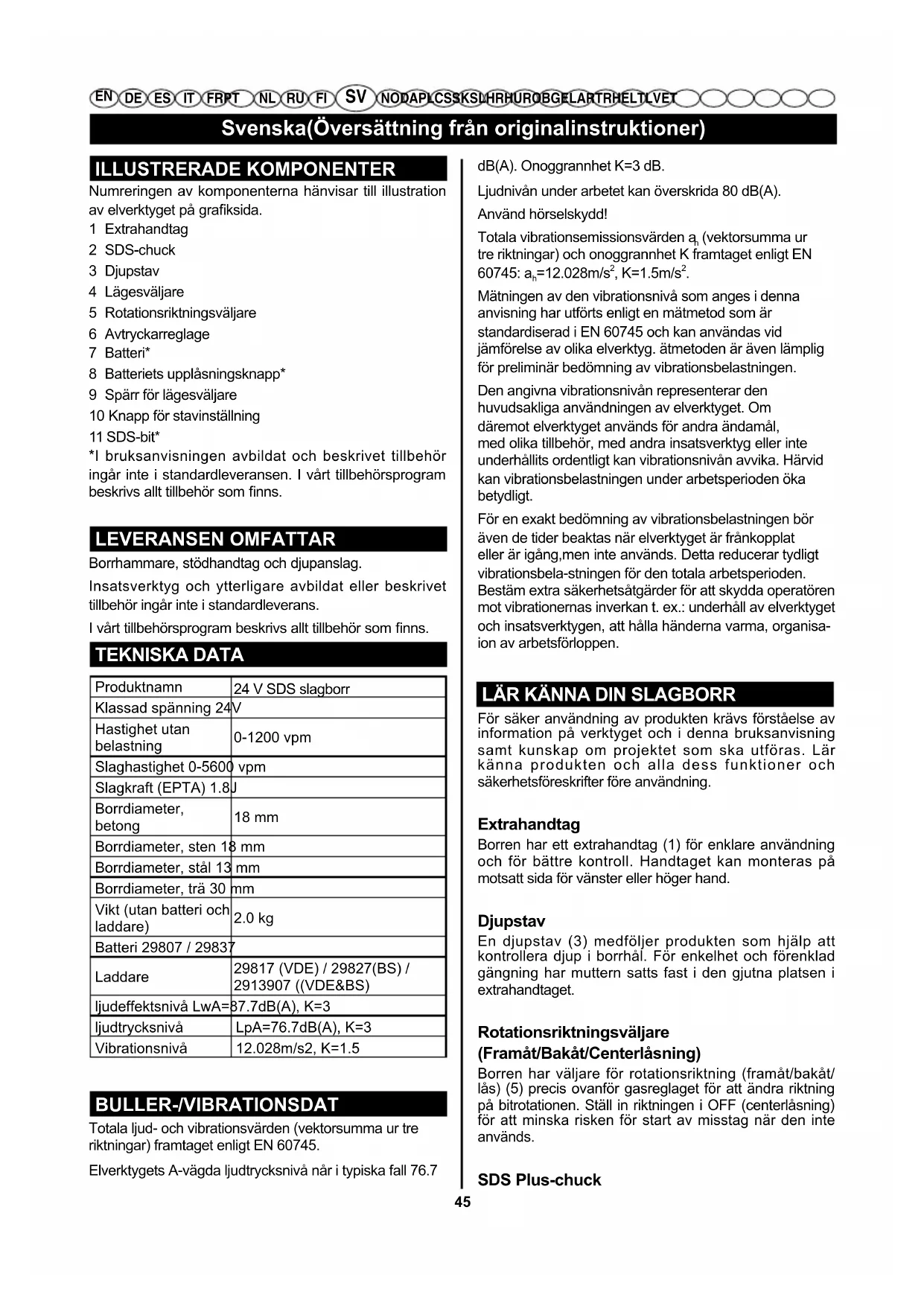 NO DA PL CS SK SL HR HU RO BG EL AR TR HE LT LV ET ILLUSTRERADE KOMPONENTER Numreringen av komponenterna hänvisar till illustration av elverktyget på graksida. 1 Extrahandtag 2 SDS-chuck 3 Djupstav 4 Lägesväljare 5 Rotationsriktningsväljare 6 Avtryckarreglage 7 Batteri* 8 Batteriets upplåsningsknapp* 9 Spärr för lägesväljare 10 Knapp för stavinställning 11 SDS-bit* *I bruksanvisningen avbildat och beskrivet tillbehör ingår inte i standardleveransen. I vårt tillbehörsprogram beskrivs allt tillbehör som nns. LEVERANSEN OMFATTAR Borrhammare, stödhandtag och djupanslag. Insatsverktyg och ytterligare avbildat eller beskrivet tillbehör ingår inte i standardleverans. I vårt tillbehörsprogram beskrivs allt tillbehör som nns. TEKNISKA DATA Produktnamn 24 V SDS slagborr Klassad spänning 24V Hastighet utan belastning 0-1200 vpm Slaghastighet 0-5600 vpm Slagkraft (EPTA) 1.8J Borrdiameter, betong 18 mm Borrdiameter, sten 18 mm Borrdiameter, stål 13 mm Borrdiameter, trä 30 mm Vikt (utan batteri och laddare)