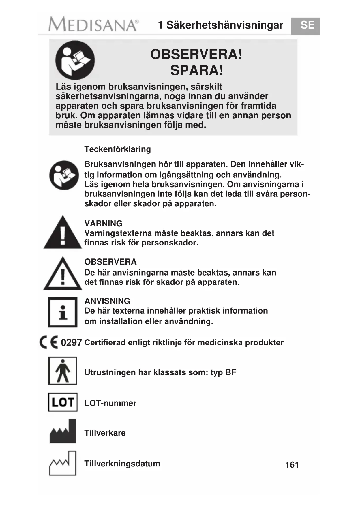 - På MEDISANAprodukter lämnas tre árs garanti, frän inköpsdatum. Inköpsdatum ská vid garantifärehavanden forevisas med inköpskvitto eller faktura.