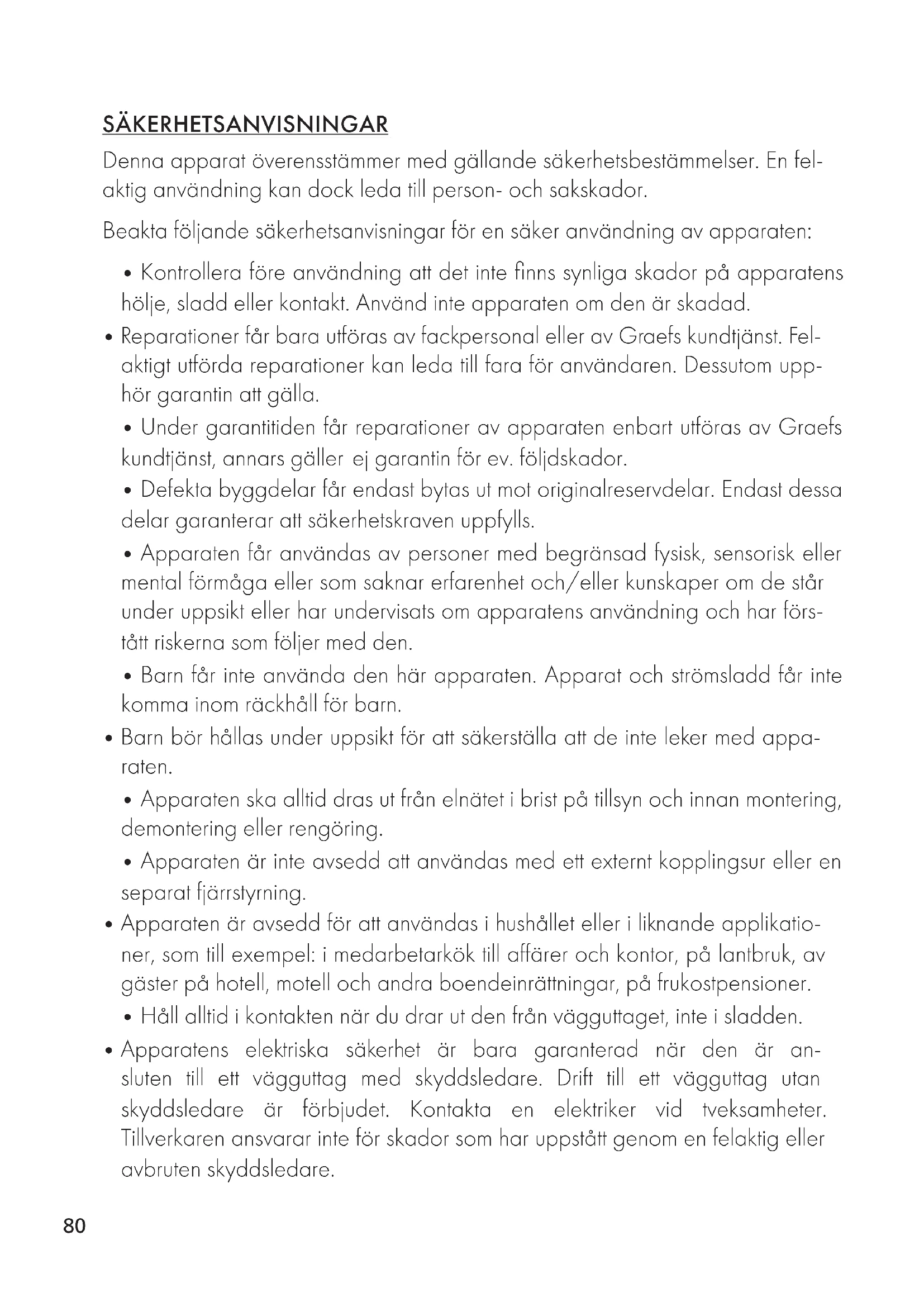 - Under garantitiden får reparationer av apparaten enbart utföras av Graefs kundtjänst, annars gäller ej garantin för ev. följdskador.