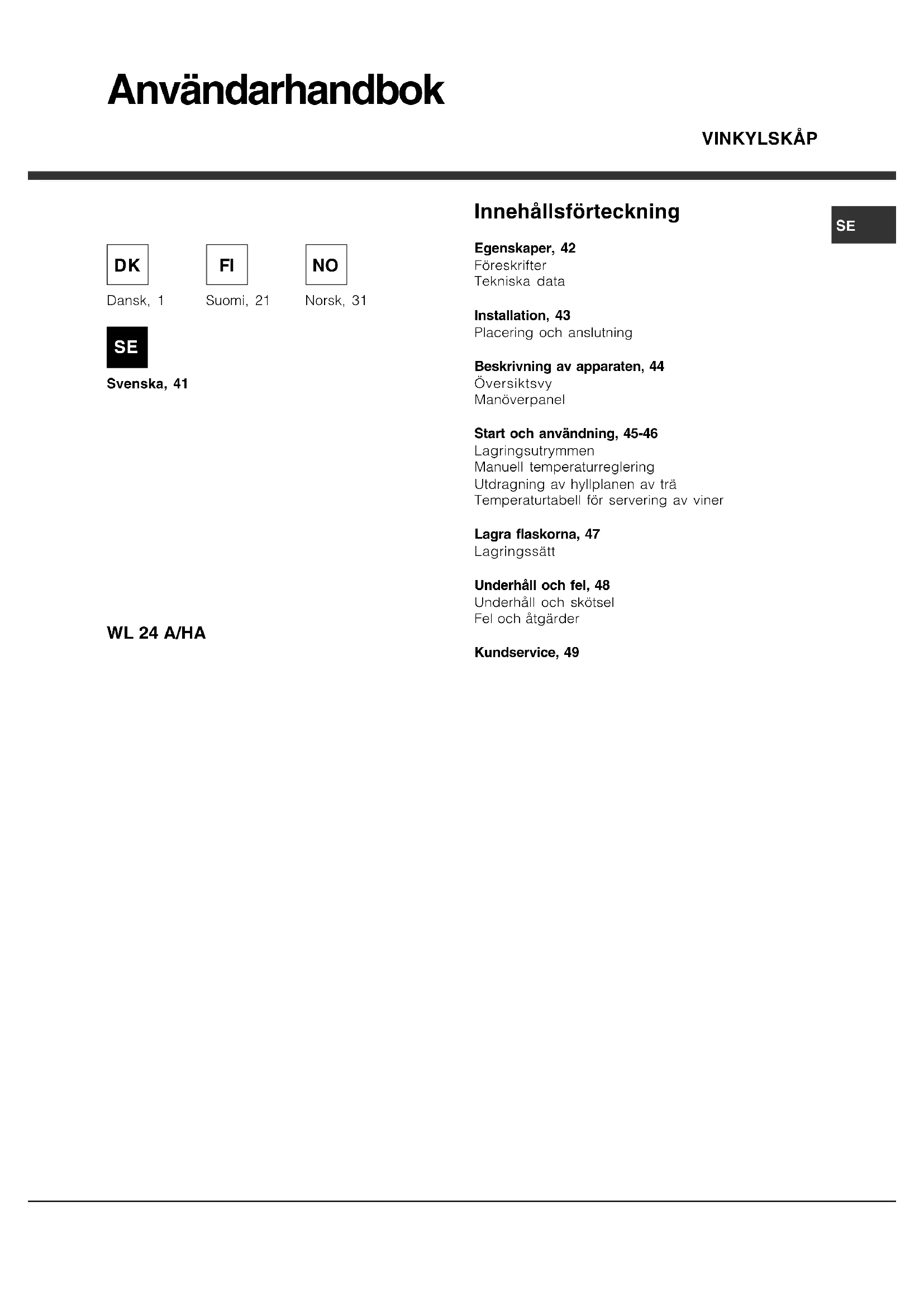 195092482.01 - B 08/2012SE UGN WL 24 A/HA Innehållsförteckning Egenskaper, 42 Föreskrifter Tekniska data Installation, 43 Placering och anslutning Beskrivning av apparaten, 44 Översiktsvy Manöverpanel Start och användning, 45-46 Lagringsutrymmen Manuell temperaturreglering Utdragning av hyllplanen av trä Temperaturtabell för servering av viner Lagra flaskorna, 47 Lagringssätt Underhåll och fel, 48 Underhåll och skötsel Fel och åtgärder Kundservice, 49 Användarhandbok VINKYLSKÅP Svenska, 41