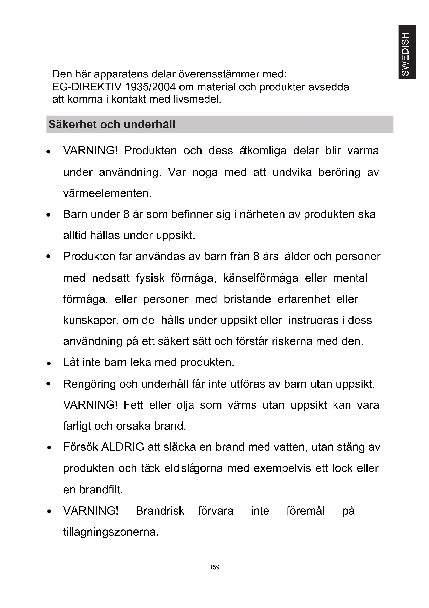 Frånkopplingsfunktionen måste byggas in i den fasta ledningsdragningen enligt elföreskrifterna. i anvisningarna ska uppges vilken typ av sladd som ska användas, med hänsyn till temperaturen på baksidan av produkten. Om strömkabeln skadas måste den ersättas av tillverkaren eller dess serviceombud eller liknande behörig person för att undvika fara. VARNING! För att undvika fara på grund av oavsiktlig återställning av värmesäkringen får inte produkten strömförsörjas genom en extern kopplingsanordning, exempelvis en timer, eller anslutas till en krets som slås till och från regelbundet av anläggningen. VARNING! Om ytan spricker ska produkten stängas av för att undvika risk för elektrisk chock. Använd inte våtdammsugare för rengöring. 160Medel för frånkoppling måste byggas in i den fasta elinstallationen i enlighet med ledningsreglerna. Instruktionerna anger den typ av kabel som ska användas och tar hänsyn till temperaturen på apparatens bakre yta.