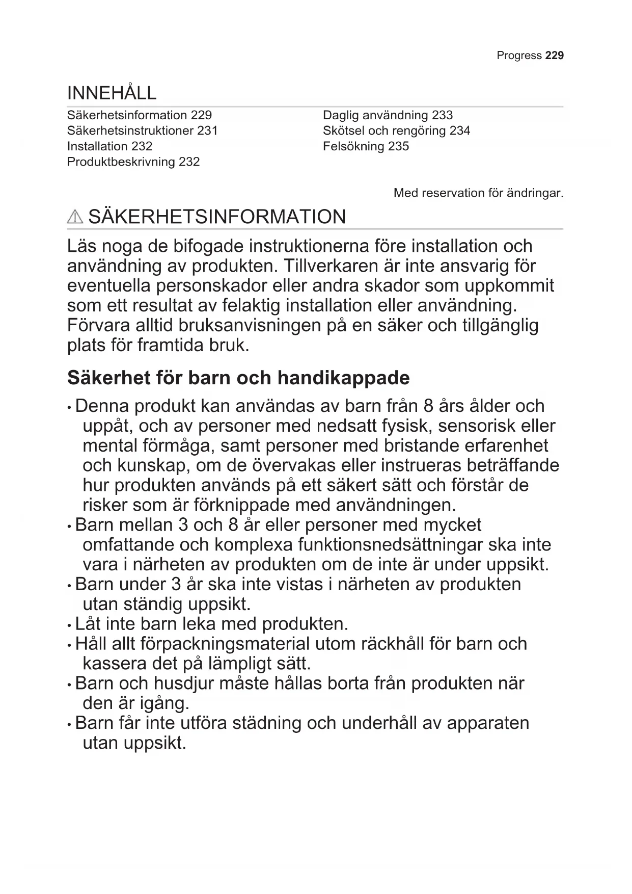 - Barn får inte utföra städning och underhåll av apparaten utan uppsikt. Progress 229Allmän säkerhet