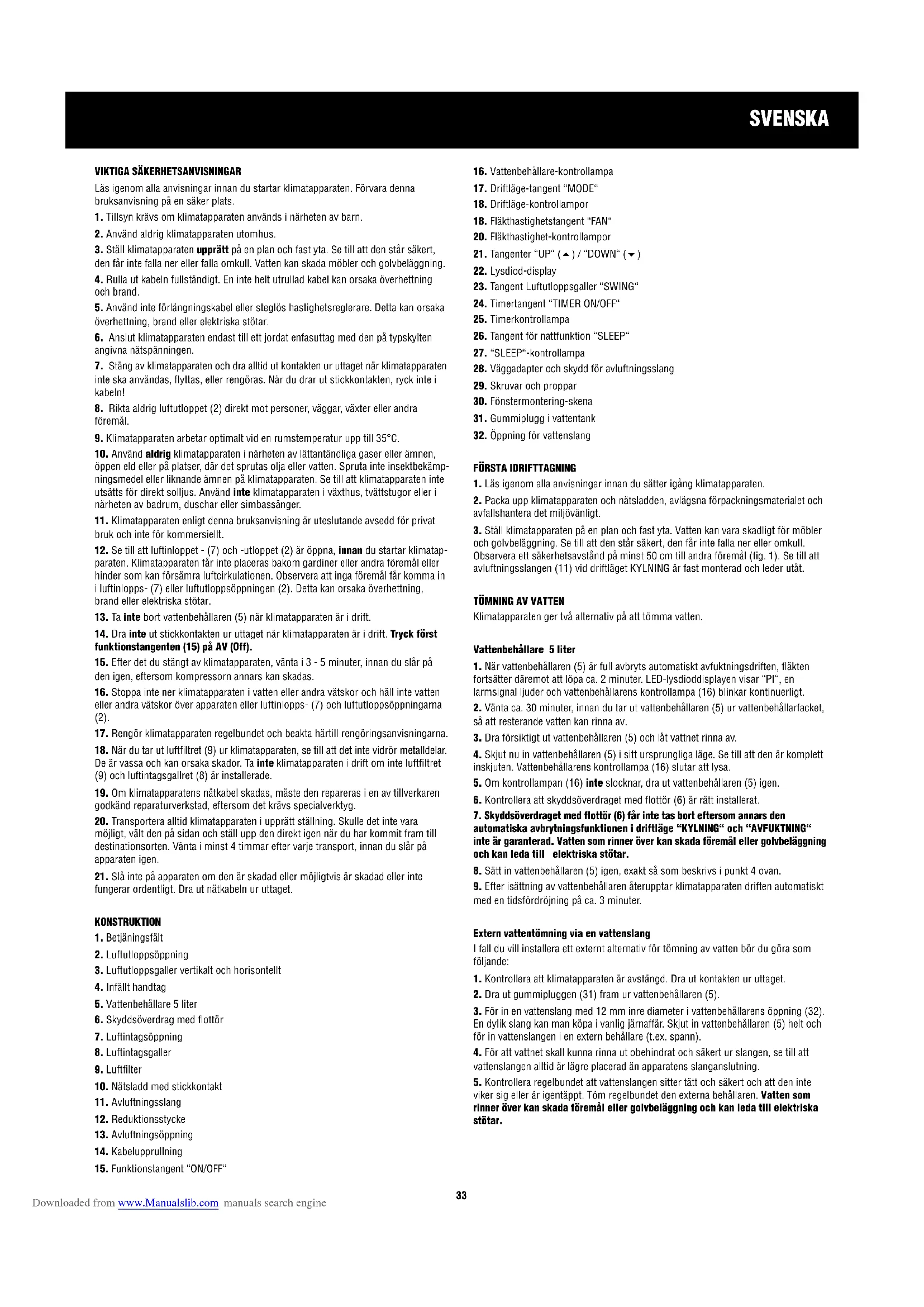 13. Ta inte bort vattenbehållaren (5) när klimatapparaten är i drift.