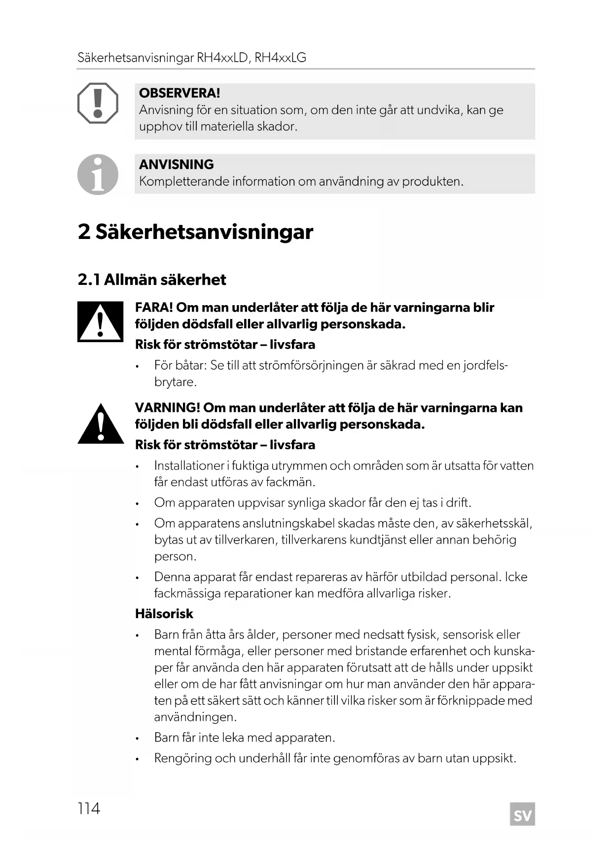 Rengöring och underhåll får inte genomföras av barn utan uppsikt. OBSERVERA! Anvisning för en situation som, om den inte går att undvika, kan ge upphov till materiella skador. ANVISNING Kompletterande information om användning av produkten. RH430-RH440-RH460-LD-LG--IO-16s.book Seite 114 Mittwoch, 17. Juli 2019 5:35 17SV RH4xxLD, RH4xxLG Säkerhetsanvisningar