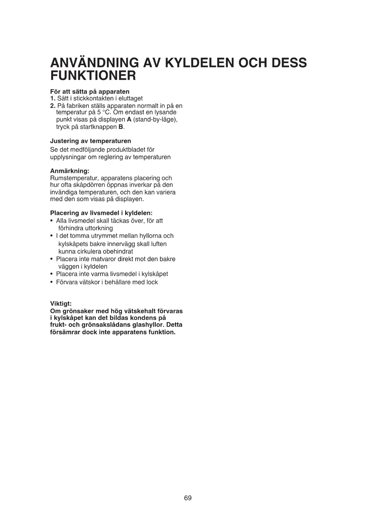 temperatur på 5 °C. Om endast en lysande punkt visas på displayen A (stand-by-läge), tryck på startknappen B. Justering av temperaturen Se det medföljande produktbladet för upplysningar om reglering av temperaturen Anmärkning: Rumstemperatur, apparatens placering och hur ofta skåpdörren öppnas inverkar på den invändiga temperaturen, och den kan variera med den som visas på displayen. Placering av livsmedel i kyldelen: