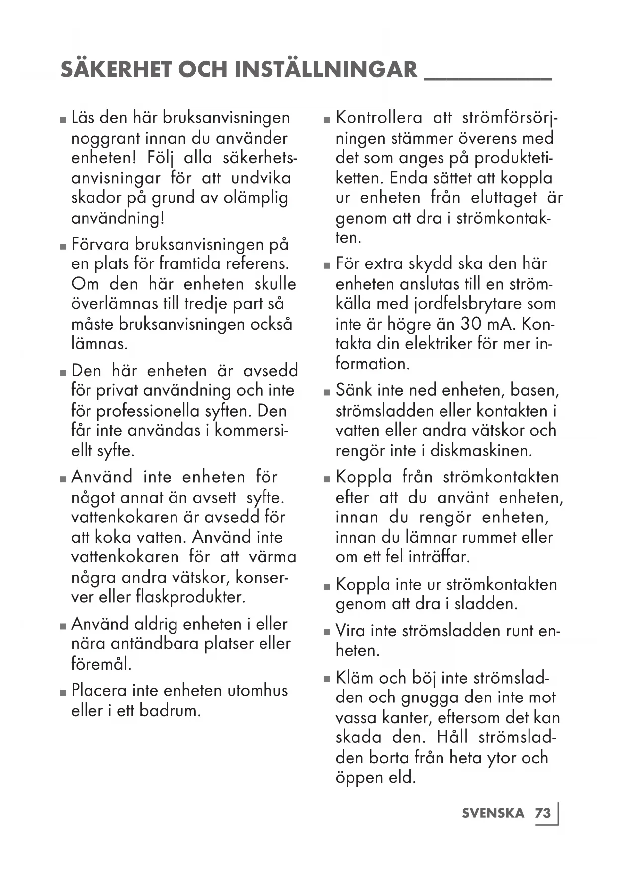 Använd inte enheten för något annat än avsett syfte. vattenkokaren är avsedd för att koka vatten. Använd inte vattenkokaren för att värma några andra vätskor, konser- ver eller flaskprodukter.