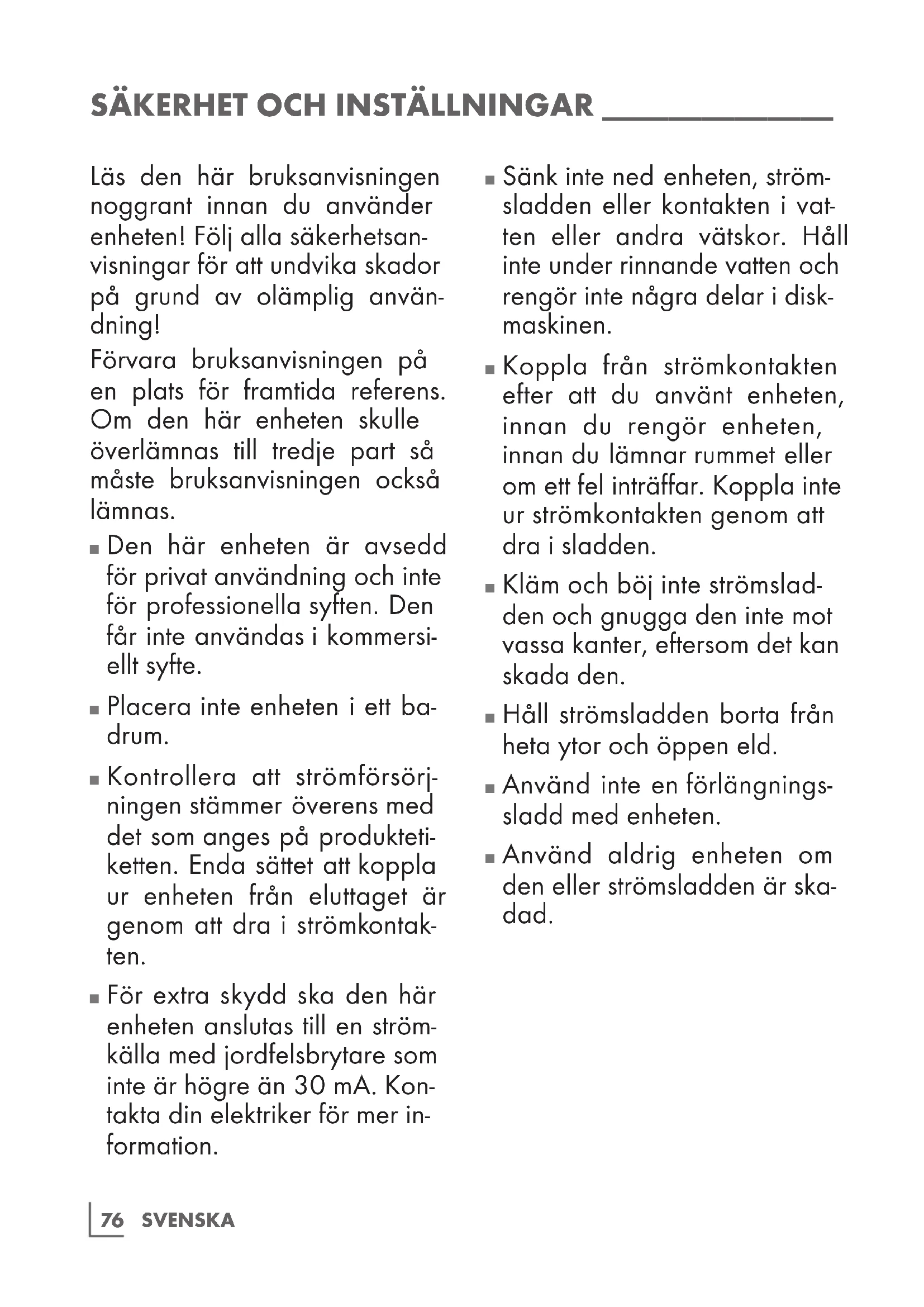 Den här enheten är avsedd för privat användning och inte för professionella syften. Den får inte användas i kommersi- ellt syfte.