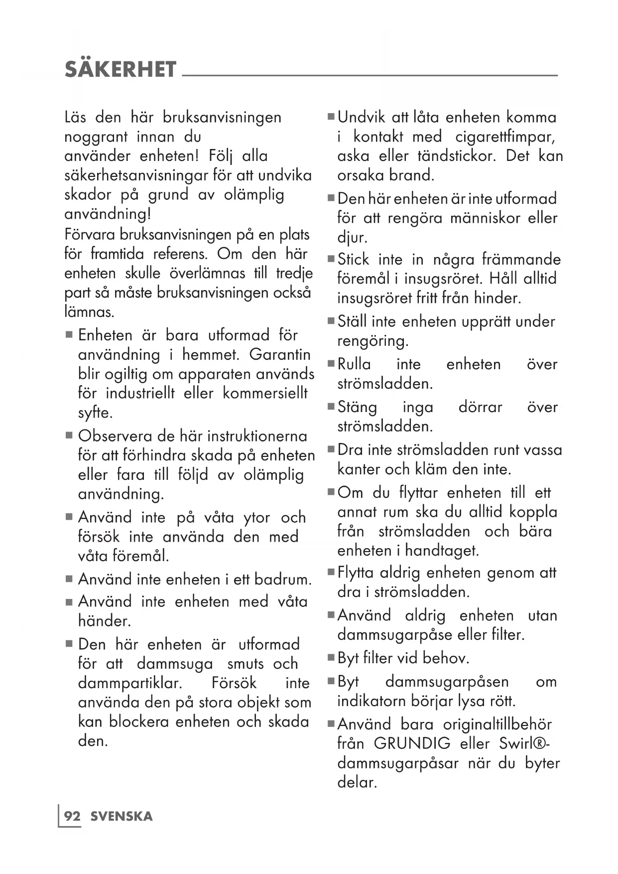 Använd bara originaltillbehör från GRUNDIG eller Swirl®- dammsugarpåsar när du byter delar.SVENSKA