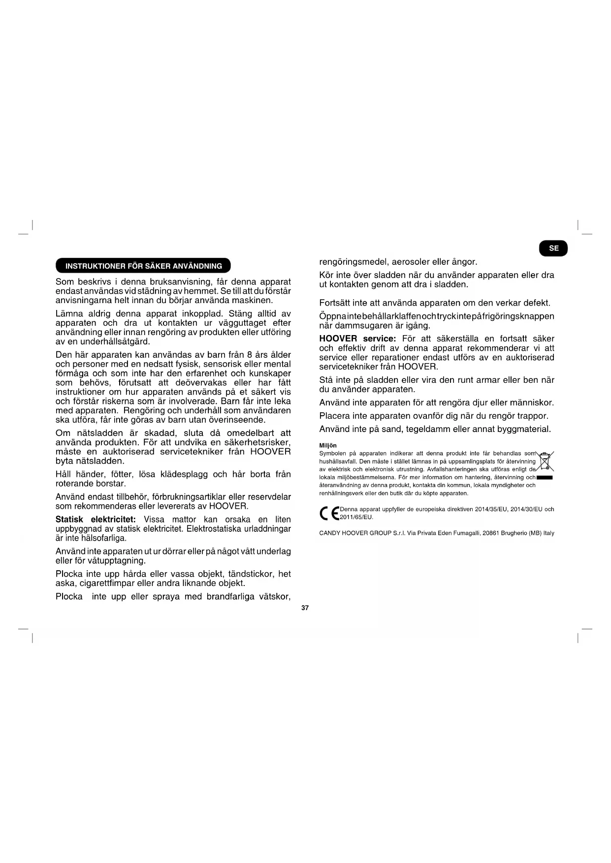 - Har støvsugeren blitt overopphetet? Hvis det er tilfellet vil det ta omtrent 30 minutter før den blir automatisk nullstilt. VIKTIGE OPPLYSNINGER Reservedeler og tilbehør fra Hoover Bruk alltid originale deler fra Hoover. Disse er tilgjengelige fra din lokale Hoover-forhandler eller direkte fra Hoover. Når du bestiller deler, må du alltid oppgi modellnummeret ditt. Hoover-service Kontakt ditt lokale Hoover servicekontor dersom du trenger assistanse, reservedeler eller forbruksartikler. Kvalitet Hoovers fabrikker har blitt uavhengig kvalitetsvurdert. Våre produkter produseres ved å bruke et kvalitetssystem som er i samsvar med ISO 9001. Din garanti Garantibetingelsene for dette apparatet er som denert av vår representant i det landet der det ble solgt. Detaljer vedrørende disse betingelsene fås fra forhandleren der apparatet ble kjøpt. Salgskvitteringen må fremvises ved fremsetting av krav under betingelsene i denne garantien.. Kan endres uten forvarsel. NO37 INSTRUKTIONER FÖR SÄKER ANVÄNDNING Som beskrivs i denna bruksanvisning, får denna apparat endast användas vid städning av hemmet. Se till att du förstår anvisningarna helt innan du börjar använda maskinen. Lämna aldrig denna apparat inkopplad. Stäng alltid av apparaten och dra ut kontakten ur vägguttaget efter användning eller innan rengöring av produkten eller utföring av en underhållsåtgärd. Den här apparaten kan användas av barn från 8 års ålder och personer med en nedsatt fysisk, sensorisk eller mental förmåga och som inte har den erfarenhet och kunskaper som behövs, förutsatt att deövervakas eller har fått instruktioner om hur apparaten används på et säkert vis och förstår riskerna som är involverade. Barn får inte leka med apparaten. Rengöring och underhåll som användaren ska utföra, får inte göras av barn utan överinseende. Om nätsladden är skadad, sluta då omedelbart att använda produkten. För att undvika en säkerhetsrisker, måste en auktoriserad servicetekniker från HOOVER byta nätsladden. Håll händer, fötter, lösa klädesplagg och hår borta från roterande borstar. Använd endast tillbehör, förbrukningsartiklar eller reservdelar som rekommenderas eller levererats av HOOVER. Statisk elektricitet: Vissa mattor kan orsaka en liten uppbyggnad av statisk elektricitet. Elektrostatiska urladdningar är inte hälsofarliga. Använd inte apparaten ut ur dörrar eller på något vått underlag eller för våtupptagning. Plocka inte upp hårda eller vassa objekt, tändstickor, het aska, cigarettmpar eller andra liknande objekt. Plocka inte upp eller spraya med brandfarliga vätskor, rengöringsmedel, aerosoler eller ångor. Kör inte över sladden när du använder apparaten eller dra ut kontakten genom att dra i sladden. Fortsätt inte att använda apparaten om den verkar defekt. Öppna inte behållarklaffen och tryck inte på frigöringsknappen när dammsugaren är igång. HOOVER service: För att säkerställa en fortsatt säker och effektiv drift av denna apparat rekommenderar vi att service eller reparationer endast utförs av en auktoriserad servicetekniker från HOOVER. Stå inte på sladden eller vira den runt armar eller ben när du använder apparaten. Använd inte apparaten för att rengöra djur eller människor. Placera inte apparaten ovanför dig när du rengör trappor. Använd inte på sand, tegeldamm eller annat byggmaterial. Miljön Symbolen på apparaten indikerar att denna produkt inte får behandlas som hushållsavfall. Den måste i stället lämnas in på uppsamlingsplats för återvinning av elektrisk och elektronisk utrustning. Avfallshanteringen ska utföras enligt de lokala miljöbestämmelserna. För mer information om hantering, återvinning och återanvändning av denna produkt, kontakta din kommun, lokala myndigheter och renhållningsverk eller den butik där du köpte apparaten. Denna apparat uppfyller de europeiska direktiven 2014/35/EU, 2014/30/EU och 2011/65/EU. CANDY HOOVER GROUP S.r.l. Via Privata Eden Fumagalli, 20861 Brugherio (MB) Italy SE38 *Endast vissa modeller **Kan variera beroende på modell A. Dammbehållarens lucka B. Dammbehållare C. Huvudlter D. Skjutreglage till väljbar effektstyrning** D1. LED-display med pekkontroller** E. På/av-pedal F. Förmotorlterslock G. Behållarhandtag H. Behållarklaffens frigöringsknapp