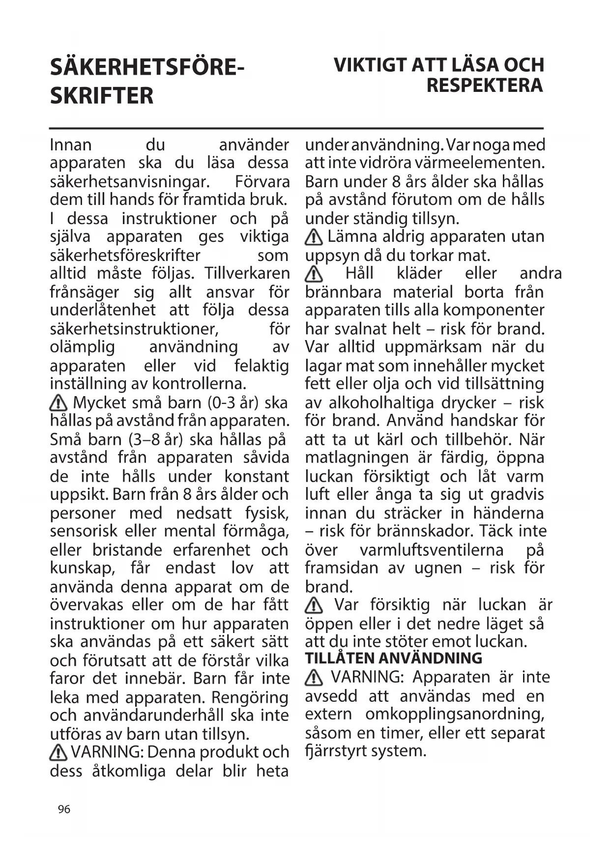 RESPEKTERA Innan du använder apparaten ska du läsa dessa säkerhetsanvisningar. Förvara dem till hands för framtida bruk. I dessa instruktioner och på själva apparaten ges viktiga säkerhetsföreskrifter som alltid måste följas. Tillverkaren frånsäger sig allt ansvar för underlåtenhet att följa dessa säkerhetsinstruktioner, för olämplig användning av apparaten eller vid felaktig inställning av kontrollerna. Mycket små barn (0-3år) ska hållas på avstånd från apparaten. Små barn (3–8år) ska hållas på avstånd från apparaten såvida de inte hålls under konstant uppsikt. Barn från 8 års ålder och personer med nedsatt fysisk, sensorisk eller mental förmåga, eller bristande erfarenhet och kunskap, får endast lov att använda denna apparat om de övervakas eller om de har fått instruktioner om hur apparaten ska användas på ett säkert sätt och förutsatt att de förstår vilka faror det innebär. Barn får inte leka med apparaten. Rengöring och användarunderhåll ska inte utföras av barn utan tillsyn. VARNING: Denna produkt och dess åtkomliga delar blir heta under användning. Var noga med att inte vidröra värmeelementen. Barn under 8 års ålder ska hållas på avstånd förutom om de hålls under ständig tillsyn. Lämna aldrig apparaten utan uppsyn då du torkar mat. Håll kläder eller andra brännbara material borta från apparaten tills alla komponenter har svalnat helt – risk för brand. Var alltid uppmärksam när du lagar mat som innehåller mycket fett eller olja och vid tillsättning av alkoholhaltiga drycker – risk för brand. Använd handskar för att ta ut kärl och tillbehör. När matlagningen är färdig, öppna luckan försiktigt och låt varm luft eller ånga ta sig ut gradvis innan du sträcker in händerna – risk för brännskador. Täck inte över varmluftsventilerna på framsidan av ugnen – risk för brand. Var försiktig när luckan är öppen eller i det nedre läget så att du inte stöter emot luckan.