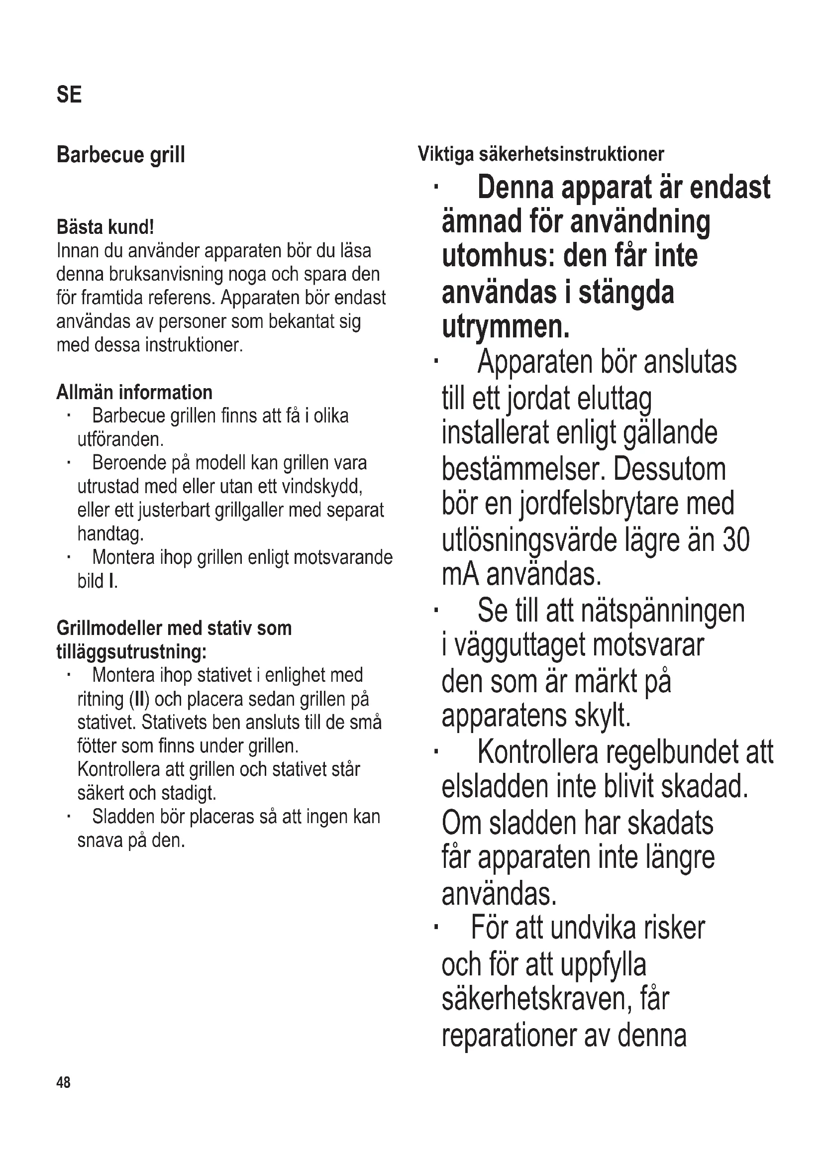 Garantierklæring På dette husholdningsprodukt overtager vi garantien i to år fra salgsdatoen. Garantien gælder for materiale- og fabrikationsfejl. Skader, der er opstået som følge af forkert behandling, normalt slid samt på skrøbelige dele som f.eks. glas, dækkes ikke af garantien. Denne garanti har ingen indvirkning på dine lovmæssige rettigheder, heller ikke de nationale forbrugerrettigheder om anskaffelse af varer. Hvis produktet ikke fungerer og må returneres, skal det pakkes forsvarligt ind, og navn, adresse samt årsagen til returneringen skal vedlægges. Hvis dette sker mens garantien stadig dækker, må garantibeviset og kvitteringen også lægges ved. Garantien bortfalder ligeledes ved indgreb på produktet af folk, der ikke er autoriseret af os.48 104 x 142 mm Barbecue grill Bästa kund! Innan du använder apparaten bör du läsa denna bruksanvisning noga och spara den för framtida referens. Apparaten bör endast användas av personer som bekantat sig med dessa instruktioner. Allmän information ∙ Barbecue grillen nns att få i olika utföranden. ∙ Beroende på modell kan grillen vara utrustad med eller utan ett vindskydd, eller ett justerbart grillgaller med separat handtag. ∙ Montera ihop grillen enligt motsvarande bild I. Grillmodeller med stativ som tilläggsutrustning: ∙ Montera ihop stativet i enlighet med ritning (II) och placera sedan grillen på stativet. Stativets ben ansluts till de små fötter som nns under grillen. Kontrollera att grillen och stativet står säkert och stadigt. ∙ Sladden bör placeras så att ingen kan snava på den. Viktiga säkerhetsinstruktioner ∙ Denna apparat är endast ämnad för användning utomhus: den får inte användas i stängda utrymmen. ∙ Apparaten bör anslutas till ett jordat eluttag installerat enligt gällande bestämmelser. Dessutom bör en jordfelsbrytare med utlösningsvärde lägre än 30 mA användas. ∙ Se till att nätspänningen i vägguttaget motsvarar den som är märkt på apparatens skylt. ∙ Kontrollera regelbundet att elsladden inte blivit skadad. Om sladden har skadats får apparaten inte längre användas. ∙ För att undvika risker och för att uppfylla säkerhetskraven, får reparationer av denna SE104 x 142 mm