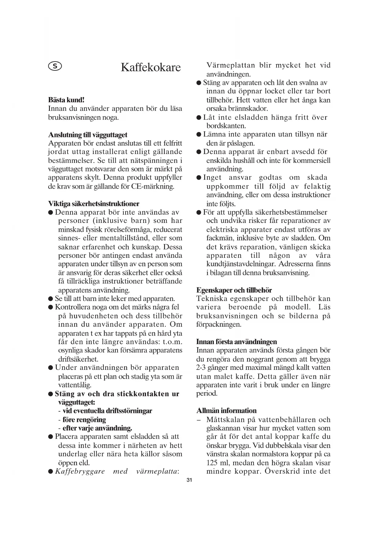 Bryggelåget rengøres ved at placere det på kanden og lade vandet eller rengøringsmidlet passere gennem låget (efter rensning af selve kanden). Bortskaffelse Gamle eller defekte apparater må aldrig smides ud sammen med husholdningsaffaldet, de må afleveres på den lokale genbrugsstation. Garantierklæring På dette husholdningsprodukt overtager vi garantien i to år fra salgsdatoen. Garantien gælder for materiale- og fabrikationsfejl. Skader, der er opstået som følge af forkert behandling, normalt slid samt på skørbare dele som f.eks. glas, dækkes ikke af garantien. Garantien bortfalder ligeledes ved indgreb på produktet af folk, der ikke er autoriseret af os. 30Bästa kund! Innan du använder apparaten bör du läsa bruksanvisningen noga. Anslutning till vägguttaget Apparaten bör endast anslutas till ett felfritt jordat uttag installerat enligt gällande bestämmelser. Se till att nätspänningen i vägguttaget motsvarar den som är märkt på apparatens skylt. Denna produkt uppfyller de krav som är gällande för CE-märkning. Viktiga säkerhetsinstruktioner ● Denna apparat bör inte användas av personer (inklusive barn) som har minskad fysisk rörelseförmåga, reducerat sinnes- eller mentaltillstånd, eller som saknar erfarenhet och kunskap. Dessa personer bör antingen endast använda apparaten under tillsyn av en person som är ansvarig för deras säkerhet eller också få tillräckliga instruktioner beträffande apparatens användning. ● Se till att barn inte leker med apparaten. ● Kontrollera noga om det märks några fel på huvudenheten och dess tillbehör innan du använder apparaten. Om apparaten t ex har tappats på en hård yta får den inte längre användas: t.o.m. osynliga skador kan försämra apparatens driftsäkerhet. ● Under användningen bör apparaten placeras på ett plan och stadig yta som är vattentålig. ● Stäng av och dra stickkontakten ur vägguttaget: - vid eventuella driftsstörningar - före rengöring - efter varje användning. ● Placera apparaten samt elsladden så att dessa inte kommer i närheten av hett underlag eller nära heta källor såsom öppen eld. ● Kaffebryggare med värmeplatta: Värmeplattan blir mycket het vid användningen. ● Stäng av apparaten och låt den svalna av innan du öppnar locket eller tar bort tillbehör. Hett vatten eller het ånga kan orsaka brännskador. ● Låt inte elsladden hänga fritt över bordskanten. ● Lämna inte apparaten utan tillsyn när den är påslagen. ● Denna apparat är enbart avsedd för enskilda hushåll och inte för kommersiell användning. ● Inget ansvar godtas om skada uppkommer till följd av felaktig användning, eller om dessa instruktioner inte följts. ● För att uppfylla säkerhetsbestämmelser och undvika risker får reparationer av elektriska apparater endast utföras av fackmän, inklusive byte av sladden. Om det krävs reparation, vänligen skicka apparaten till någon av våra kundtjänstavdelningar. Adresserna finns i bilagan till denna bruksanvisning. Egenskaper och tillbehör Tekniska egenskaper och tillbehör kan variera beroende på modell. Läs bruksanvisningen och se bilderna på förpackningen. Innan första användningen Innan apparaten används första gången bör du rengöra den noggrant genom att brygga 2-3 gånger med maximal mängd kallt vatten utan malet kaffe. Detta gäller även när apparaten inte varit i bruk under en längre period. Allmän information