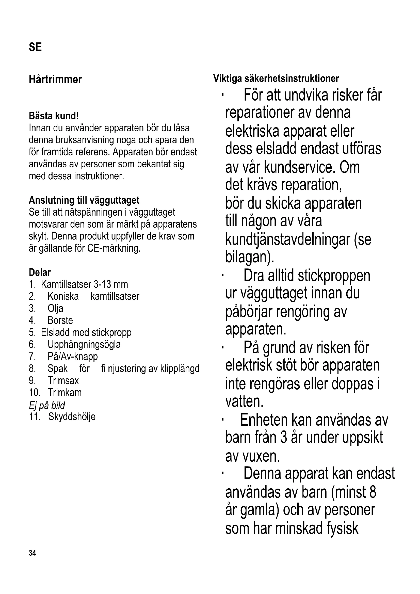 Viktiga säkerhetsinstruktioner ∙ För att undvika risker får reparationer av denna elektriska apparat eller dess elsladd endast utföras av vår kundservice. Om det krävs reparation, bör du skicka apparaten till någon av våra kundtjänstavdelningar (se bilagan). ∙ Dra alltid stickproppen ur vägguttaget innan du påbörjar rengöring av apparaten. ∙ På grund av risken för elektrisk stöt bör apparaten inte rengöras eller doppas i vatten. ∙ Enheten kan användas av barn från 3 år under uppsikt av vuxen. ∙ Denna apparat kan endast användas av barn (minst 8 år gamla) och av personer som har minskad fysisk SE35 rörelseförmåga, reducerat sinnes- eller mentaltillstånd, eller som har bristfällig erfarenhet och kunskap, förutsatt att dessa personer är under uppsyn eller har fått tillräckliga instruktioner beträffande apparatens användning och vet vilka risker och säkerhetsåtgärder som användningen innefattar. ∙ Barn bör inte tillåtas leka med apparaten. ∙ Rengöring och användningsunderhåll får endast utföras av barn som är under uppsikt av vuxen. ∙ Apparaten och dess elsladd bör hållas utom räckhåll för barn under 3 år. ∙ Varning: Håll barn på avstånd från apparatens förpackningsmaterial eftersom fara eventuellt kan uppstå. Det fi nns t.ex. risk för kvävning. ∙ Varning: Använd inte apparaten i närheten av ett badkar eller handfat fyllt med vatten, eller annan behållare innehållande vatten. ∙ Varning: Skydda apparaten mot fukt och koppla inte på den om du har våta händer. ∙ Om apparaten används i ett badrum är förekomsten av vatten en fara även när apparaten är avstängd. Dra därför alltid stickproppen ur vägguttaget efter användningen. Ytterligare säkerhet kan uppnås genom att man installerar en jordfelsbrytare med utlösningsvärde lägre än 30 mA. Rådgör med en elektriker. ∙ Kontrollera noga om det märks några fel innan apparaten används, både på huvudenheten och monterade tillsatser. Om apparaten t ex har tappats på en hård yta får den inte längre användas. Även osynliga skador kan försämra apparatens driftsäkerhet. ∙ Stäng alltid av apparaten och dra stickproppen ur vägguttaget efter användningen, samt också - om apparaten skulle uppvisa fel och - före rengöring. ∙ Tag stickproppen ur vägguttaget genom att dra i stickproppen, aldrig i sladden. ∙ Varning: trimsaxen är extremt vass; för att undvika skador bör du alltid se till att kniven inte kommer i kontakt med huden när apparaten är i användning. ∙ Lämna aldrig apparaten utan uppsikt när den är i användning. ∙ Inget ansvar godtas om skada uppkommer till följd av felaktig användning, eller om dessa instruktioner inte följts. ∙ Använd inte apparaten på husdjur eller andra djur.36 Användning Finjustering av klipplängden Spaken på sidan av trimmern gör det möjligt att enkelt fi njustera klipplängden från ca 1 mm till 1,6 mm, även medan du klipper. Trimhuvuden De medföljande kamtillsatserna erbjuder fl era klipplängder. Montera kamtillsatsen på kammen genom att trycka fast den tills du hör att den låses på plats. Efter klippningen lösgör du tillsatsens bakre del och lyfter bort kamtillsatsen. Trimhuvuden 3-13 mm Trimhuvudena medger en klipplängd på 3, 6, 9 och 13 mm. Koniska trimhuvuden Med de koniska trimhuvudena klipper du håret medan du undviker att håret blir klippt med “trappeffekt”. Med detta trimhuvud klipps håret ovanför öronen kortare än partierna mitt på huvudet. Klippning ∙ Innan du börjar klippa bör håret vara tvättat och noga kammat. ∙ För längre hår används en kamtillsats eller vanlig kam. ∙ Börja alltid med den största löstagbara kammen, eftersom detta hjälper dig att få en uppfattning om hur du klipper håret till önskad längd. ∙ För en kortare frisyr fortsätter du med en mindre löstagbar kam eller utan någon kamtillsats alls. ∙ Sätt stickproppen i vägguttaget och koppla på apparaten. ∙ Börja från nacken och klipp uppåt hjässan med hårtrimmerns kam liggande mot huvudet, för apparaten uppåt genom håret och fl ytta den samtidigt längre ifrån huvudet. ∙ De koniska kamtillsatserna är ämnade för att klippa håret runt öronen medan du undviker att klippa håret ojämnt. För högra sidan av huvudet använder du tillbehöret som är märkt ‘Right Taper’; för motsatt sida använder du det som är märkt ‘Left Taper’. Börja klippa underifrån mot tinningen, mot den naturliga växtriktningen. ∙ För en uppklippt frisyr vänder du på hårtrimmern och klipper håret från hjässan mot nacken utan kamtillsats. ∙ Stäng alltid av apparaten efter användningen och dra stickproppen ur vägguttaget.37 Rengöring och skötsel ∙ Det är viktigt att hårtrimmern stängs av och att stickproppen tas ur vägguttaget innan rengöring och oljning påbörjas. ∙ Av säkerhetsskäl bör apparaten inte behandlas med vätskor eller nersänkas i dem. ∙ Använd inte repande eller frätande rengöringsmedel. ∙ Vid behov kan apparatens hölje torkas av med en torr trasa som inte avger ludd. Trimkammen och trimsaxen ∙ Efter varje användning bör hår som fastnat mellan trimkammen och trimsaxen avlägsnas med rengöringsborsten. ∙ Efter rengöring och även när hårtrimmern använts i ca. 20 minuter, bör du sätta några droppar syrafri olja mellan trimkammen och trimsaxen och därefter starta hårtrimmern en kort stund så att oljan fördelas jämnt. Regelbunden smörjning med olja garanterar ett bra klippresultat för en lång tid och förlänger sålunda hårtrimmerns livslängd. ∙ Sätt skyddshöljet över trimsaxen när den inte är i användning. Avfallshantering Enheter märkta med denna symbol måste kasseras separat från hushållsavfallet, eftersom de innehåller värdefulla material som kan återvinnas. Korrekt avfallshantering skyddar miljön och människors hälsa. Din lokala myndighet eller återf
