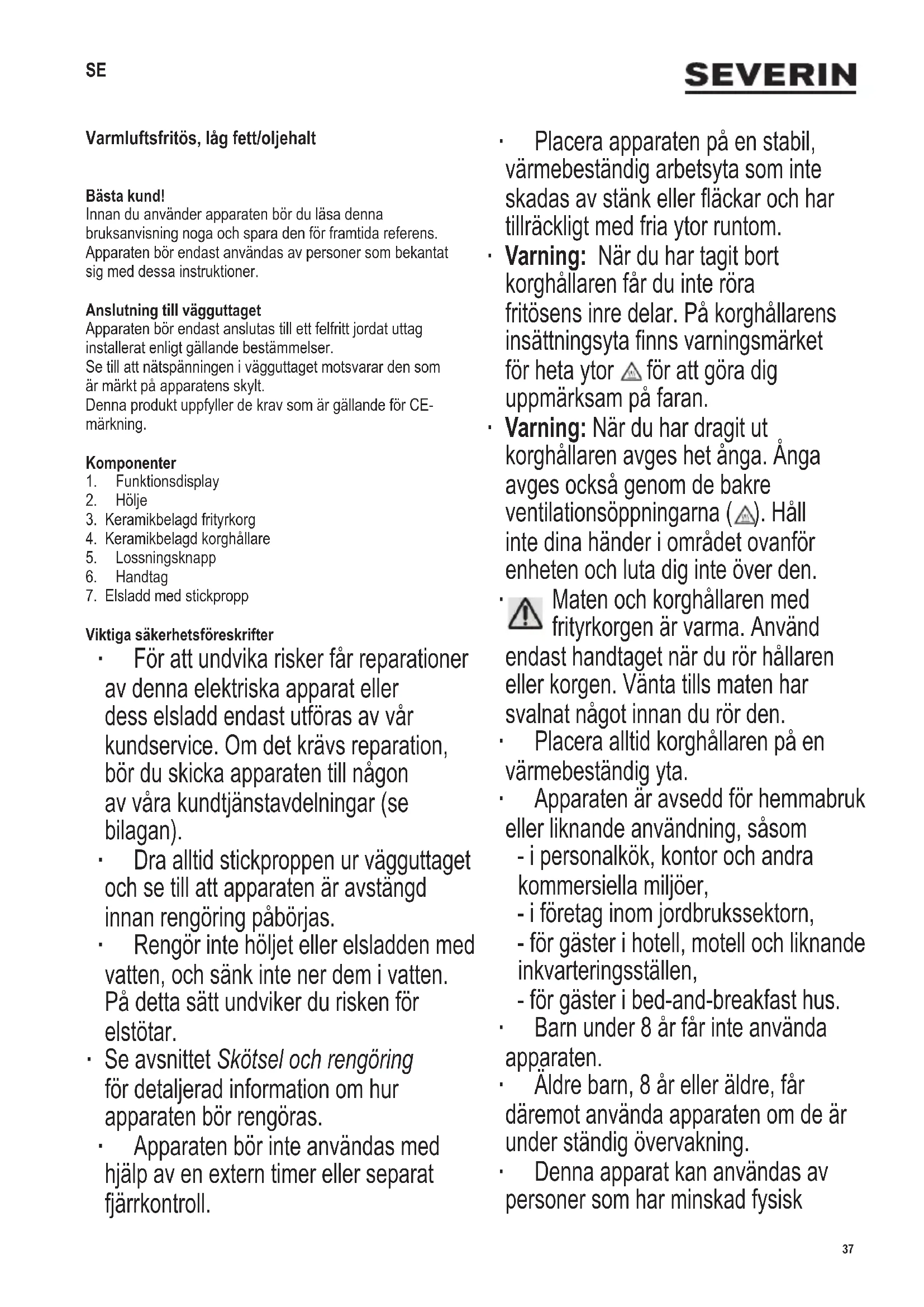 av automatiska program, steg 4-9. Användbara tips för varmluftsfritering ∙ Du kan tillreda din mat genom att använda de automatiska basprogramsinställningarna eller justera inställningarna enligt egna önskemål. ∙ Notera att tillagningstiderna endast är ungefärliga. Beroende på typen av mat behöver tillagningstiderna och -temperaturerna eventuellt justeras. ∙ Med större matmängd ökas tillagningstiden. Vi rekommenderar att du vänder maten ofta. ∙ Om maten blir alltför mörk kan du försöka sänka temperaturen först, innan du förkortar tillagningstiden. ∙ För näringsrik och hälsosam fritering rekommenderar vi en maximal temperaturinställning på 170 °C när du friterar mat vars innehåll av kolhydrater är över medeltalet. En sänkt friteringstemperatur, kombinerad med en motsvarande minskning i mängden mat, gör att det bildas en minimal mängd ämnen som är skadliga för hälsan. Skötsel och rengöring ∙ Dra alltid stickproppen ur vägguttaget och låt fritösen svalna tillräckligt innan rengöring påbörjas. ∙ Varning: För att undvika risken för elstöt bör du inte rengöra frityrkorgens hölje eller dess elsladd med vätska och sänk inte någon av dessa i vatten. ∙ För att förhindra repor på frityrkorgens och korghållarens keramiska ytor bör du inte använda slipmedel eller starka rengöringsmedel. ∙ Korgen och korghållaren bör rengöras med varmt diskvatten. Torka dem torra efteråt. ∙ Varning: Lägg inga delar i diskmaskin. ∙ Apparatens utsida och korghållarens insättningsyta kan rengöras med en fuktig, luddfri duk. Sladdförvaring När apparaten har svalnat kan du lägga tillbaka elsladden i förvaringsfacket på baksidan. Avfallshantering Enheter märkta med denna symbol måste kasseras separat från hushållsavfallet, eftersom de innehåller värdefulla material som kan återvinnas. Korrekt avfallshantering skyddar miljön och människors hälsa. Din lokala myndighet eller återförsäljare kan ge information i ärendet. Garanti i Sverige och Finland För material- och tillverkningsfel gäller 2 års garanti räknat från inköpsdagen mot uppvisande av specicerat inköpskvitto i överensstämmelse med de allmänna garantivillkoren. Denna garanti inverkar inte på dina lagstadgade rättigheter eller dina lagenliga rättigheter enligt den nationella konsumentskyddslagstiftningen. Ifall apparaten används felaktigt, eller vårdslöst, ansvarar den som använder apparaten för eventuella material- och personskador. Tillverkas för: Severin Elektrogeräte GmbH, Tyskland.41 142 x 208 mm Kuumailmakeitin Hyvä Asiakas, Lue seuraavat ohjeet huolellisesti ennen laitteen käyttöä ja säilytä tämä opas tulevaa tarvetta varten. Laitetta saavat käyttää vain henkilöt, jotka ovat tutustuneet näihin ohjeisiin. Verkkoliitäntä Laite tulee liittää määräysten mukaisesti asennettuun, maadoitettuun pistorasiaan. Varmista, että verkkojännite vastaa laitteen arvokilpeen merkittyä jännitettä. Tämä tuote on kaikkien voimassa olevien CE-merkintöjä koskevien direktiivien mukainen. Osat