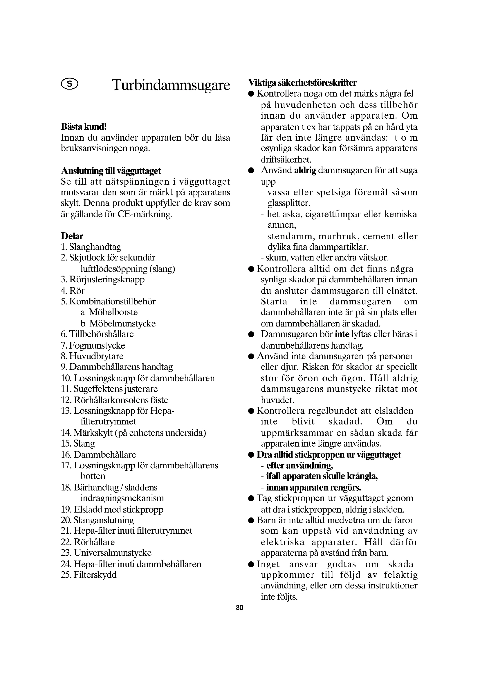 Turbindammsugare ● Denna apparat är enbart avsedd för enskilda hushåll och inte för kommersiell användning. ● För att uppfylla säkerhetsbestämmelserna och undvika risker får reparationer av elektriska apparater endast utföras av fackmän, inklusive byte av sladden. Om det krävs en reparation, bör du vänligen skicka apparaten till någon av våra kundtjänstavdelningar. Adresserna finns i bilagan till denna bruksanvisning. Innan första användningen