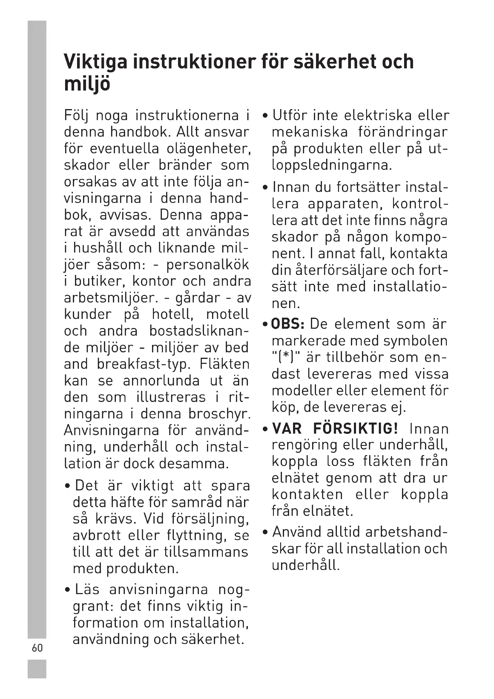 PL60 Viktiga instruktioner för säkerhet och miljö Följ noga instruktionerna i denna handbok. Allt ansvar för eventuella olägenheter, skador eller bränder som orsakas av att inte följa an- visningarna i denna hand- bok, avvisas. Denna appa- rat är avsedd att användas i hushåll och liknande mil- jöer såsom: - personalkök i butiker, kontor och andra arbetsmiljöer. - gårdar - av kunder på hotell, motell och andra bostadsliknan- de miljöer - miljöer av bed and breakfast-typ. Fläkten kan se annorlunda ut än den som illustreras i rit- ningarna i denna broschyr. Anvisningarna för använd- ning, underhåll och instal- lation är dock desamma.