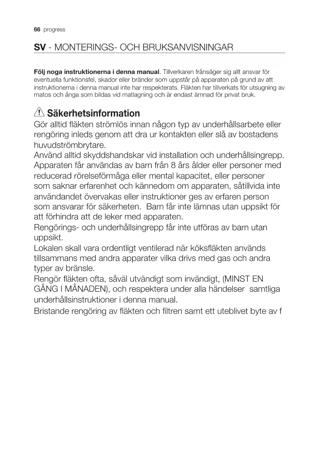 Följ noga instruktionerna i denna manual. Tillverkaren frånsäger sig allt ansvar för eventuella funktionsfel, skador eller bränder som uppstår på apparaten på grund av att instruktionerna i denna manual inte har respekterats. Fläkten har tillverkats för utsugning av matos och ånga som bildas vid matlagning och är endast ämnad för privat bruk. Säkerhetsinformation Gör alltid fläkten strömlös innan någon typ av underhållsarbete eller rengöring inleds genom att dra ur kontakten eller slå av bostadens huvudströmbrytare. Använd alltid skyddshandskar vid installation och underhållsingrepp. Apparaten får användas av barn från 8 års ålder eller personer med reducerad rörelseförmåga eller mental kapacitet, eller personer som saknar erfarenhet och kännedom om apparaten, såtillvida inte användandet övervakas eller instruktioner ges av erfaren person som ansvarar för säkerheten. Barn får inte lämnas utan uppsikt för att förhindra att de leker med apparaten. Rengörings och underhållsingrepp får inte utföras av barn utan uppsikt. Lokalen skall vara ordentligt ventilerad när köksfläkten används tillsammans med andra apparater vilka drivs med gas och andra typer av bränsle. Rengör fläkten ofta, såväl utvändigt som invändigt, (MINST EN GÅNG I MÅNADEN), och respektera under alla händelser samtliga underhållsinstruktioner i denna manual. Bristande rengöring av fläkten och filtren samt ett uteblivet byte av fprogress 67 Säkerhetsinstruktioner Använd endast den typ av lampor som anges i denna handbok i kapitles Underhåll/ Byte av lampa när lampan skall bytas ut. Varning! Anslut inte apparaten till elnätet innan installationen är helt slutförd. Vad beträffar de tekniska föreskrifter och säkerhetsåtgärder som skall vidtas för avledning av utblåsningsluften, skall de föreskrifter som utfärdats av lokala myndigheter noga efterlevas. Utblåsningsluften får inte ledas in i rökkanal som används för avledning av rökångor som kommer från apparater vilka matas med gas eller andra typer av bränsle. Använd eller lämna aldrig fläkten utan korrekt imonterade lampor för att undvika risken för elektriska stötar. Fläkten får aldrig användas utan att gallret är korrekt monterat! Fläkten får ALDRIG användas som avställningsyta om inte detta är uttryckligen angivet. Använd endast de medlevererade fixeringsskruvarna eller införskaffa skruvar av korrekt typ. Använd skruvar med rätt längd enligt föreskrifterna i Installationsguiden. I händelse av tvivel, kontakta Servicekontoret eller behörig personal. Varning! I det fall skruvar och fixeringsanordningar inte installeras enligt dessa instruktioner kan elektriska risker uppstå. Miljöskydd Återvinn material med symbolen . Återvinn förpackningen genom att placera den i lämpligt kärl. Bidra till att skydda vår miljö och vår hälsa genom att återvinna avfall från elektriska och elektroniska produkter. Släng inte produkter märkta med symbolen med hushållsavfallet. Lämna in produkten på närmaste återvinningsstation eller kontakta kommunkontoret. Användning Installation Fläkten har tillverkats för att användas som utsugningsversion med utvändig evakuering eller som filterversion med intern återcirkulation . Installation Nätspänningen skall motsvara spänningen som anges på märkplåten som sitter inne i fläkten. Om fläkten är utrustad med stickkontakt skall denna anslutas till ett uttag som är lättillgängligt även efter installationen och som uppfyller gällande föreskrifter. I det fall fläkten saknar stickkontakt (direktanslutning till nätet), eller om uttaget är placerat på en svåråtkomlig plats skall en godkänd tvåpolig strömbrytare installeras som garanterar en fullkomlig frånkoppling från nätet i samband med överspänningsklass III, i enlighet med installationsbestämmelserna. Varning!kontrollera innan fläktens krets ansluts med nätspänningen att den fungerar korrekt och är korrekt monterad.68 progress Minsta tillåtna avstånd mellan kokkärlens stödyta på spishällen och köksfläktes underkant är 45cm om det är frågan om en elektrisk spis och 55cm om det är frågan om gasspis eller kombinerad gashäll. Om spishällens instruktioner anger ett större avstånd skall detta respekteras. Underhåll Varning! Gör alltid fläkten strömlös innan någon typ av underhållsarbete eller rengöring inleds genom att slå ifrån bostadens huvudströmbrytare. Fläkten skall rengöras ofta, såväl invändigt som utvändigt (åtminstone med samma underhållsintervall som för fettfiltren). Använd en trasa fuktad med neutrala rengöringsmedel vid rengöring. Undvik produkter som innehåller slipmedel. ANVÄND INTE ALKOHOL! Varning! Observera att en bristande rengöring av apparaten och icke utförda filterbyten kan medföra brandrisk. Följ därför ovanstående instruktioner noga. Tillverkaren frånsäger sig allt ansvar för eventuella motorskador, eldsvådor beroende på ett bristande underhåll eller att dessa instruktioner inte respekterats. Observera att en bristande rengöring av apparaten och filtren kan medföra brandrisk. Följ därför ovanstående instruktioner noga. Fettlter Filtret skall rengöras en gång i månaden, med ett milt rengöringsmedel, för hand eller i diskmaskin, med låg temperatur och kort program. Vi tvätt i diskmaskin kan fettfiltret av metall missfärgas utan att detta på något sätt påverkar filtrets uppsugningsförmåga. Aktivt kollter som INTE kan rengöras Kolfiltret mättas efter en mer eller mindre lång tidsperiod beroende på i vilken utsträckning fläkten används, på typen av matlagning och hur regelbundet fettfiltren rengörs. Det är under alla händelser nödvändigt att ersätta kolfilterpatronen minst var 4 månad. Filtret kan INTE rengöras eller återanvändas.progress 69 Kommandon Fläkten är utrustad med en manöverpanel med en hastighetskontroll och en strömbrytare f