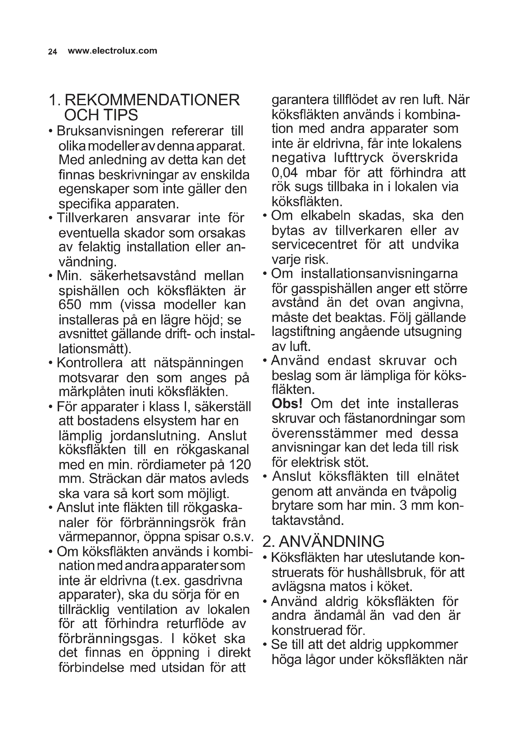 - Om köksäkten används i kombi- nation med andra apparater som inte är eldrivna (t.ex. gasdrivna apparater), ska du sörja för en tillräcklig ventilation av lokalen för att förhindra returöde av förbränningsgas. I köket ska det nnas en öppning i direkt förbindelse med utsidan för att garantera tillödet av ren luft. När köksäkten används i kombina- tion med andra apparater som inte är eldrivna, får inte lokalens negativa lufttryck överskrida 0,04 mbar för att förhindra att rök sugs tillbaka in i lokalen via köksäkten.