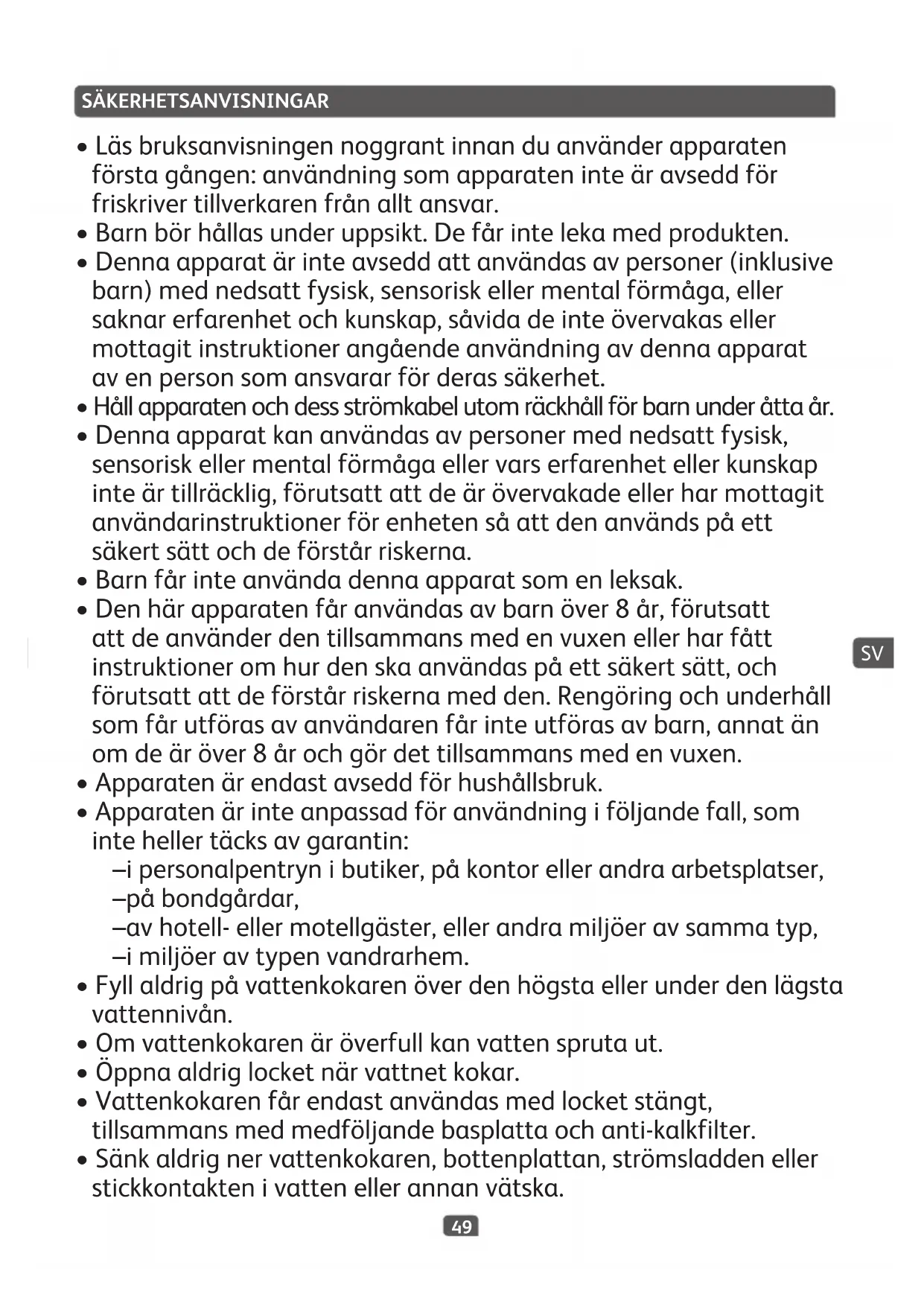 - Sänkaldrignervattenkokaren,bottenplattan,strömsladdeneller stickkontaktenivattenellerannanvätska. SÄKERHETSANVISNINGAR SV50