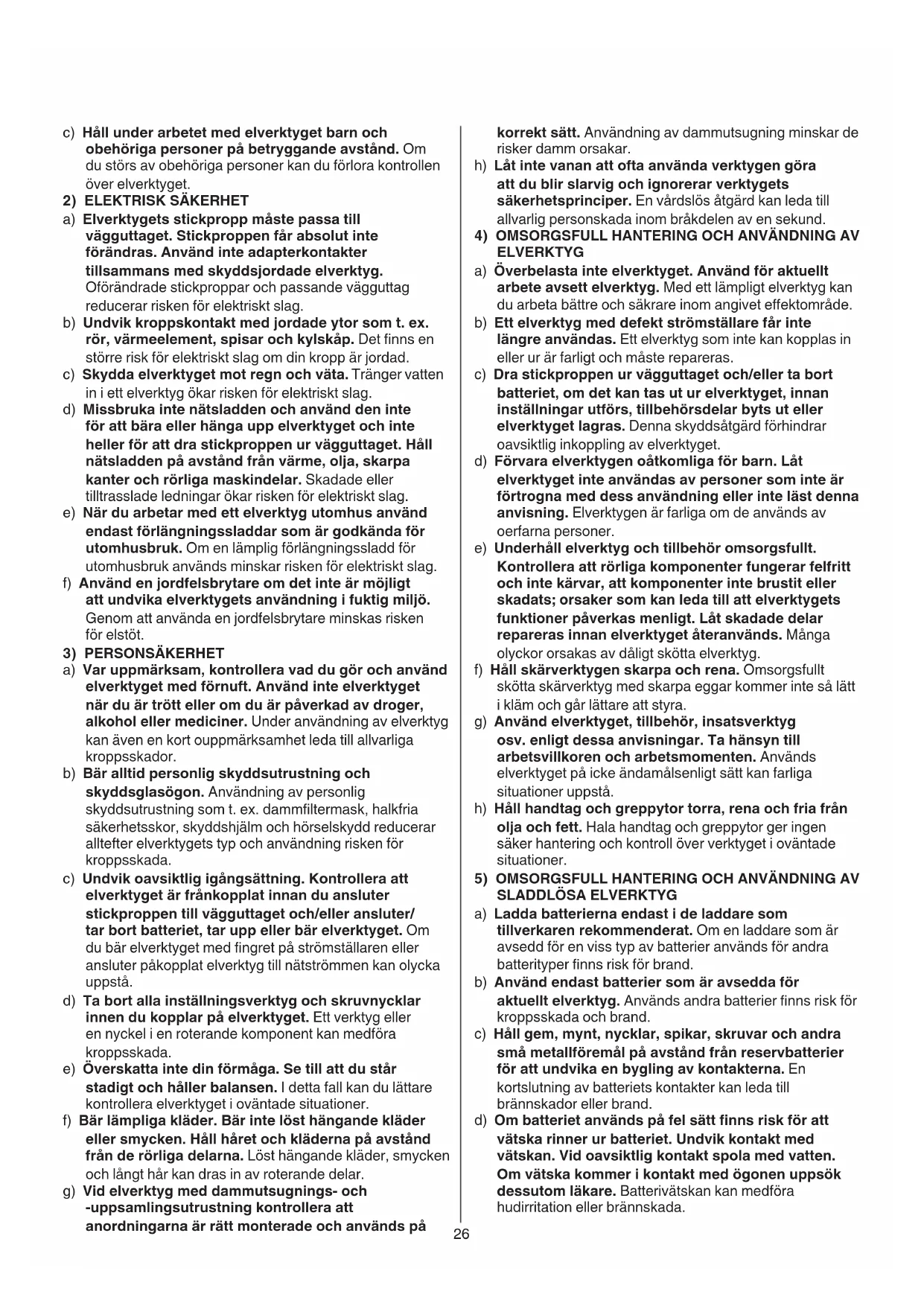 ELVERKTYG - VARNING Studera alla varningar, anvisningar, bilder och specikationer gällande säkerhet som medföljer verktyget. Om anvisningarna inte följs kan det resultera i elektriska stötar, brand och/eller allvarliga personskador. Förvara alla varningar och anvisningar för framtida bruk. Nedan använt begrepp “elverktyg” hänför sig till nätdrivna elverktyg (med nätsladd) och till batteridrivna elverktyg (sladdlösa).