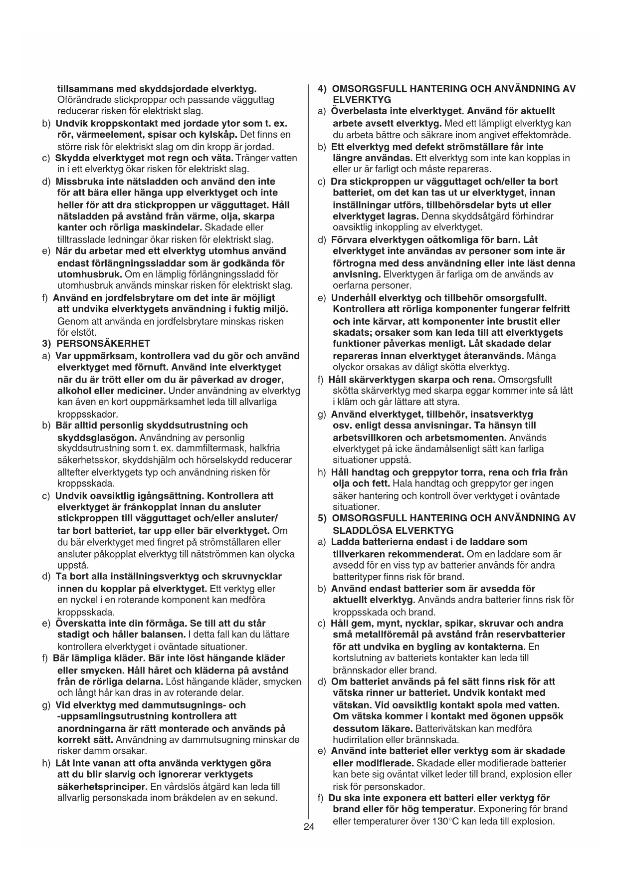 ELVERKTYG - VARNING Studera alla varningar, anvisningar, bilder och specikationer gällande säkerhet som medföljer verktyget. Om anvisningarna inte följs kan det resultera i elektriska stötar, brand och/eller allvarliga personskador. Förvara alla varningar och anvisningar för framtida bruk. Nedan använt begrepp “elverktyg” hänför sig till nätdrivna elverktyg (med nätsladd) och till batteridrivna elverktyg (sladdlösa).