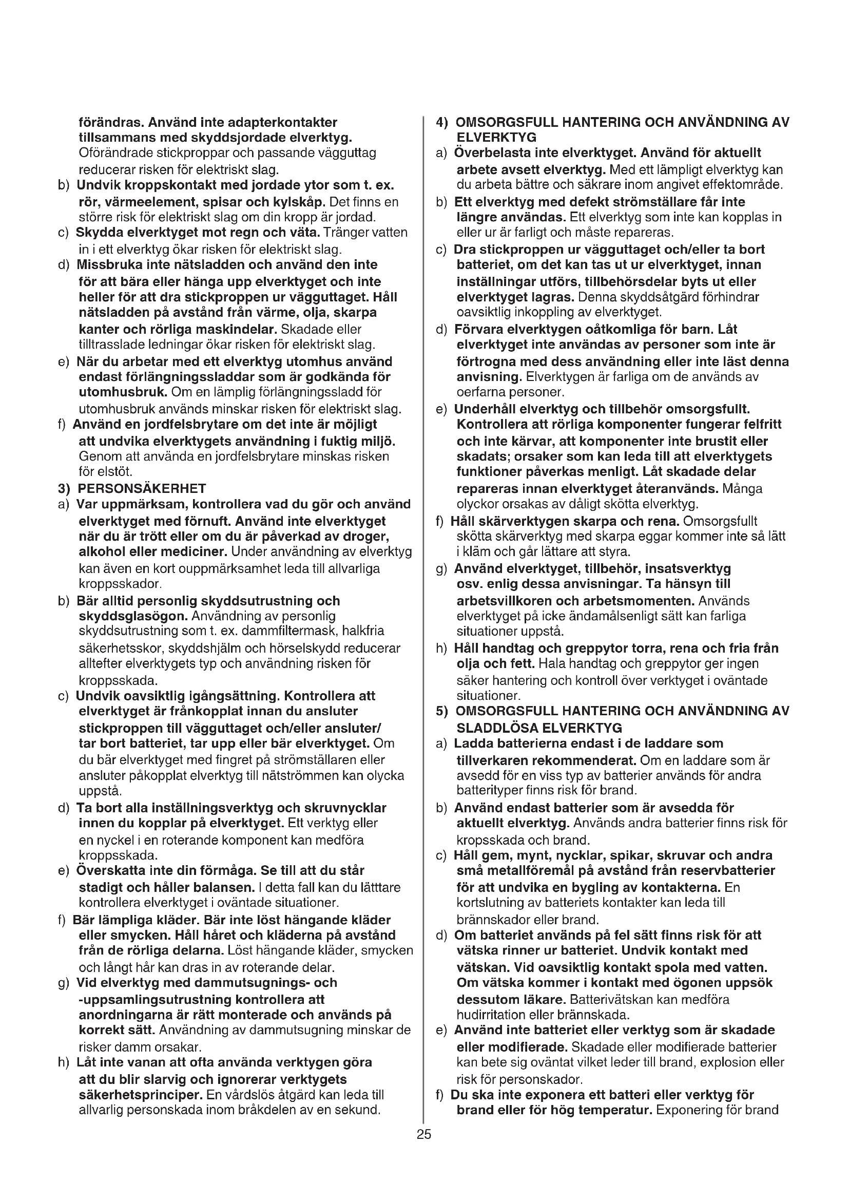 a) Låt elverktyget repareras endast av kvalicerad fackpersonal och med originalreservdelar. Detta garanterar att elverktygets säkerhet upprätthålls. b) Utför aldrig service på skadade batterier. Service på batterier får endast utföras av tillverkaren eller auktoriserade tjänsteleverantörer.