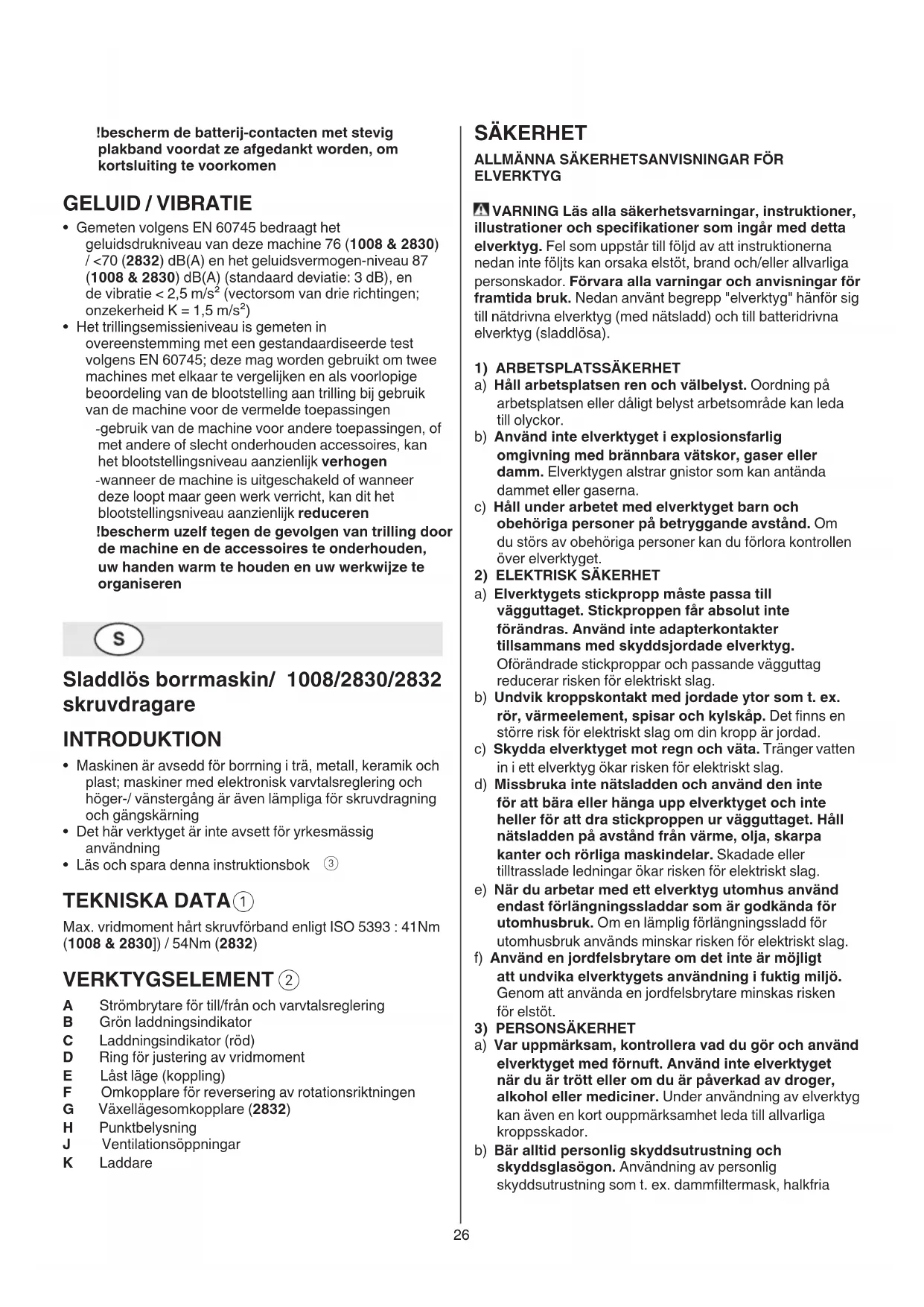 A Strömbrytare för till/från och varvtalsreglering B Grön laddningsindikator C Laddningsindikator (röd) D Ring för justering av vridmoment E Låst läge (koppling) F Omkopplare för reversering av rotationsriktningen G Växellägesomkopplare (2832) H Punktbelysning J Ventilationsöppningar K Laddare27 h) Håll handtag och greppytor torra, rena och fria från olja och fett. Hala handtag och greppytor ger ingen säker hantering och kontroll över verktyget i oväntade situationer.