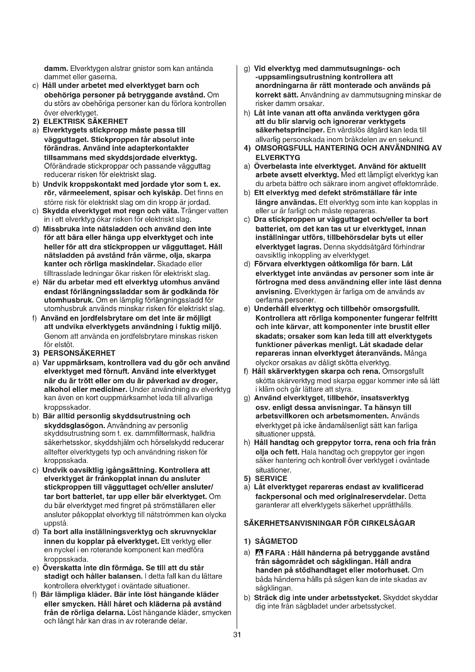 FARA : Håll händerna på betryggande avstånd från sågområdet och sågklingan. Håll andra handen på stödhandtaget eller motorhuset. Om båda händerna hålls på sågen kan de inte skadas av sågklingan. b) Sträck dig inte under arbetsstycket. Skyddet skyddar dig inte från sågbladet under arbetsstycket. damm. Elverktygen alstrar gnistor som kan antända dammet eller gaserna. c) Håll under arbetet med elverktyget barn och obehöriga personer på betryggande avstånd. Om du störs av obehöriga personer kan du förlora kontrollen över elverktyget.