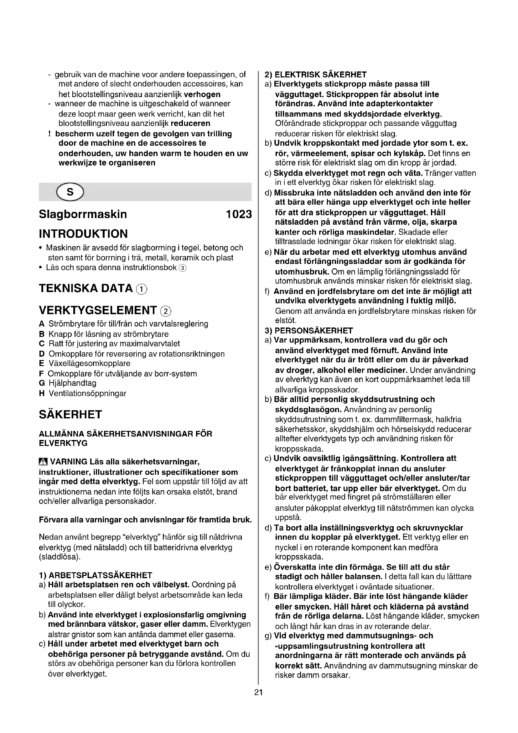 - Läs och spara denna instruktionsbok 3 TEKNISKA DATA 1 VERKTYGSELEMENT 2 A Strömbrytare för till/från och varvtalsreglering B Knapp för låsning av strömbrytare C Ratt för justering av maximalvarvtalet D Omkopplare för reversering av rotationsriktningen E Växellägesomkopplare F Omkopplare för utväljande av borr-system G Hjälphandtag H Ventilationsöppningar SÄKERHET